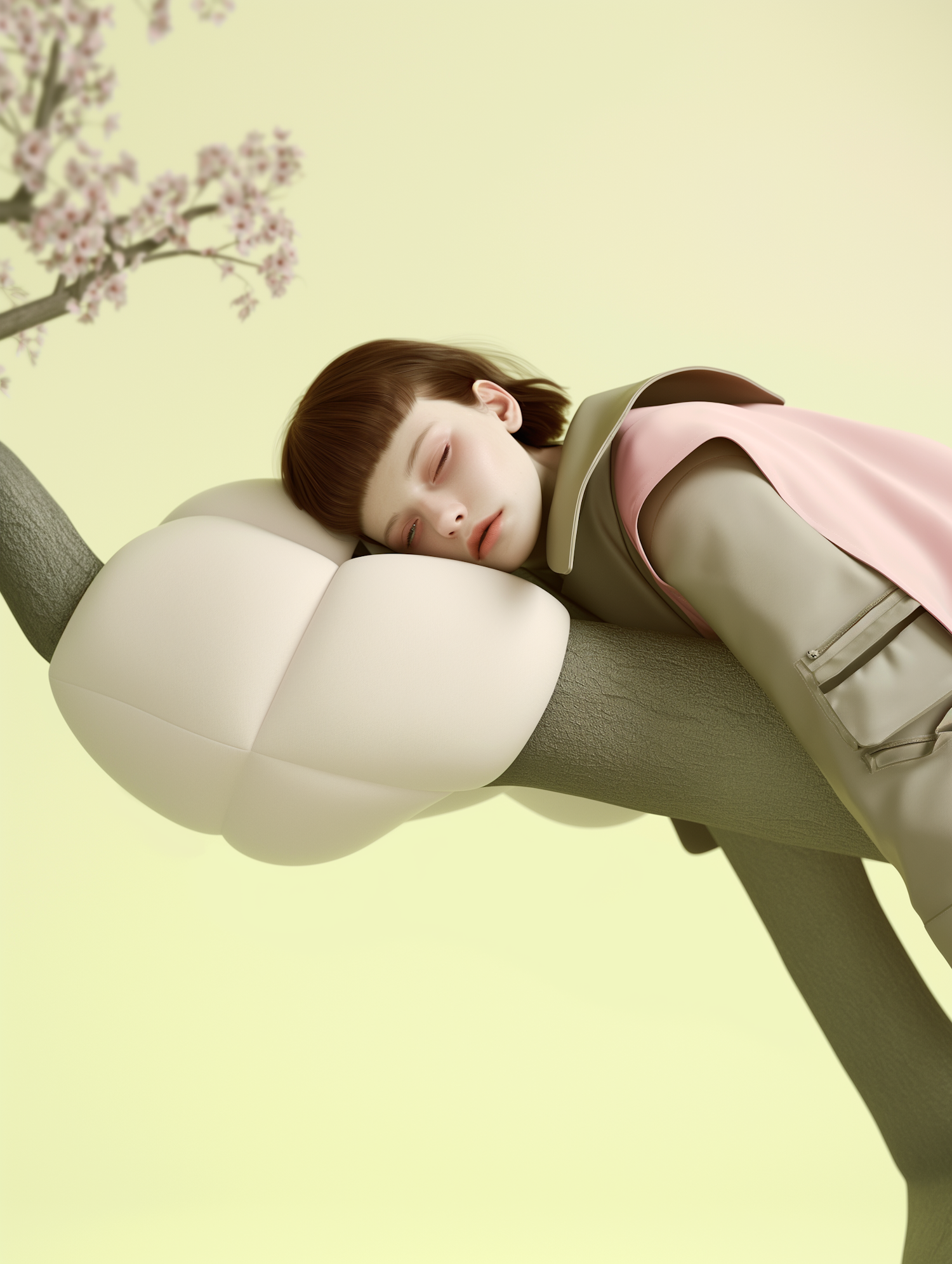 A peaceful scene of a person resting on a cushion-like branch with pastel tones and pink blossoms, evoking a dreamy, serene vibe.