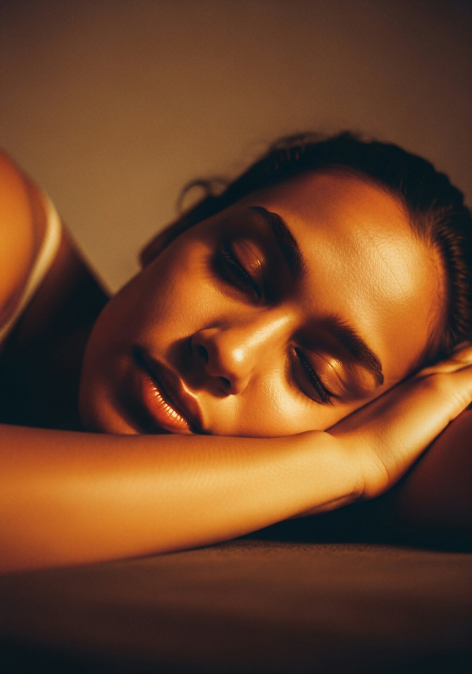 A serene close-up of a person resting, bathed in warm light, highlighting their peaceful expression and smooth skin texture.