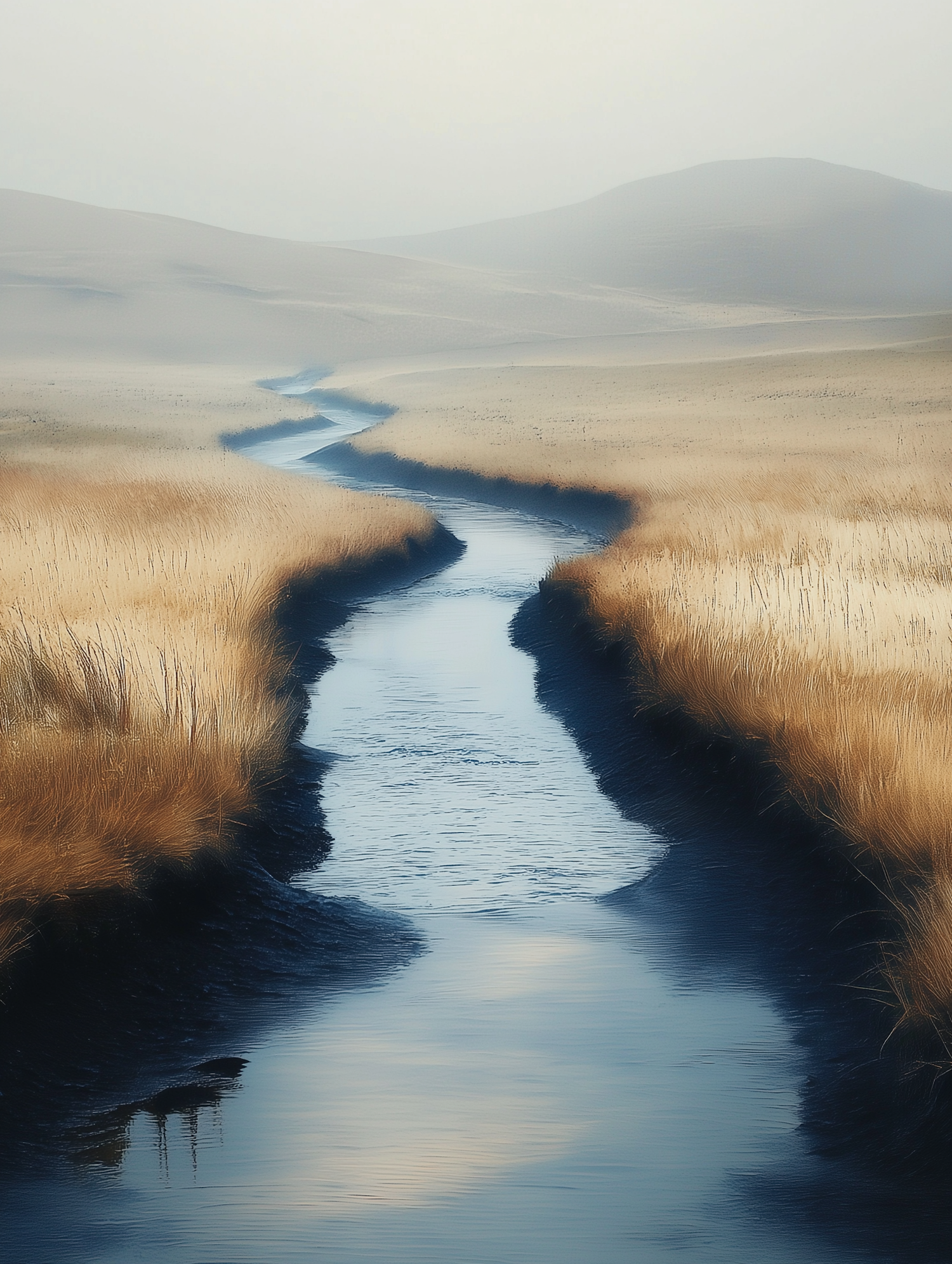 A tranquil stream winds through golden grasslands with misty hills in the background, creating a serene and dreamlike landscape.