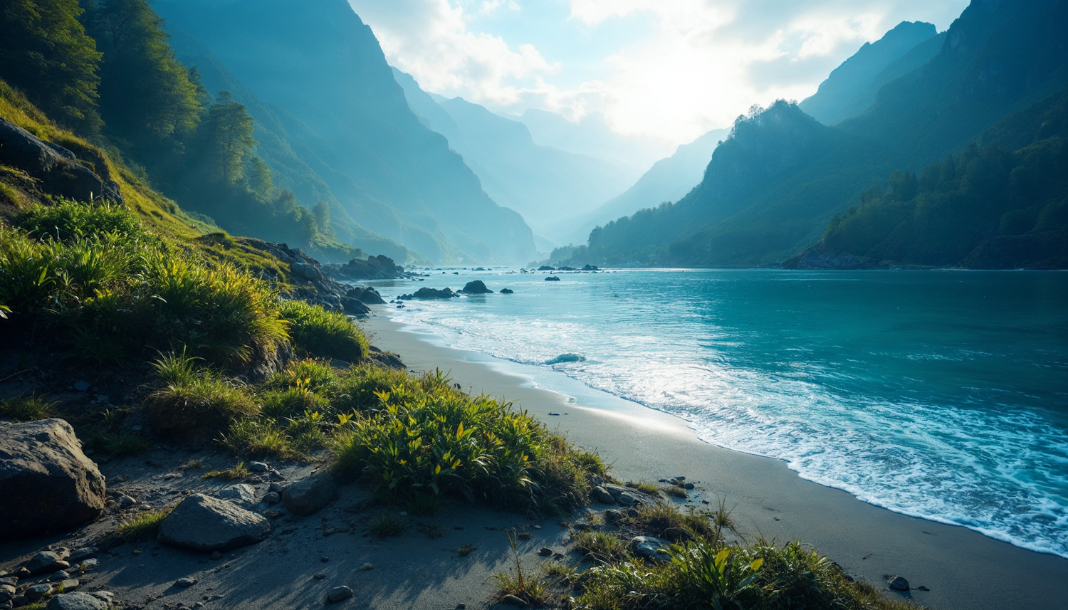 Tranquil river scene with turquoise waters, lush greenery, and misty mountains under soft sunlight. A serene and peaceful landscape.
