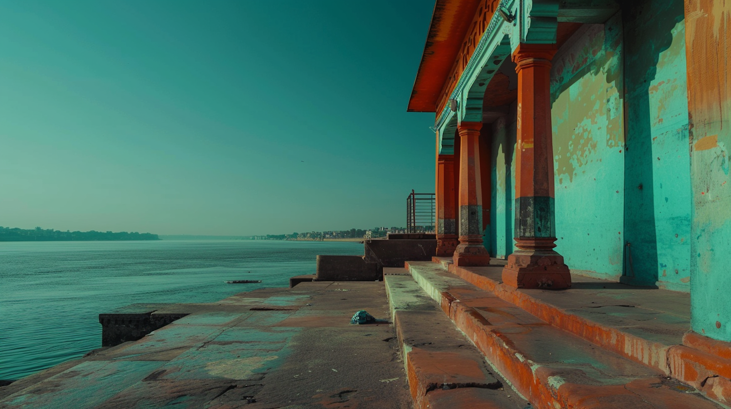 Vibrant riverside scene with turquoise and orange building, ornate columns, and calm river reflecting a clear sky.