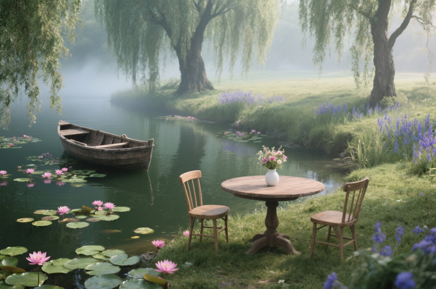 A peaceful riverside scene with a wooden table, chairs, a vase of flowers, a rowboat, and blooming water lilies under willow trees.