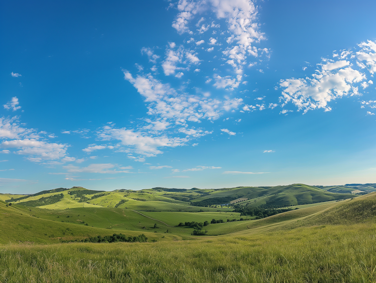 Serene landscape of rolling green hills under a bright blue sky with fluffy clouds, creating a tranquil and picturesque scene.