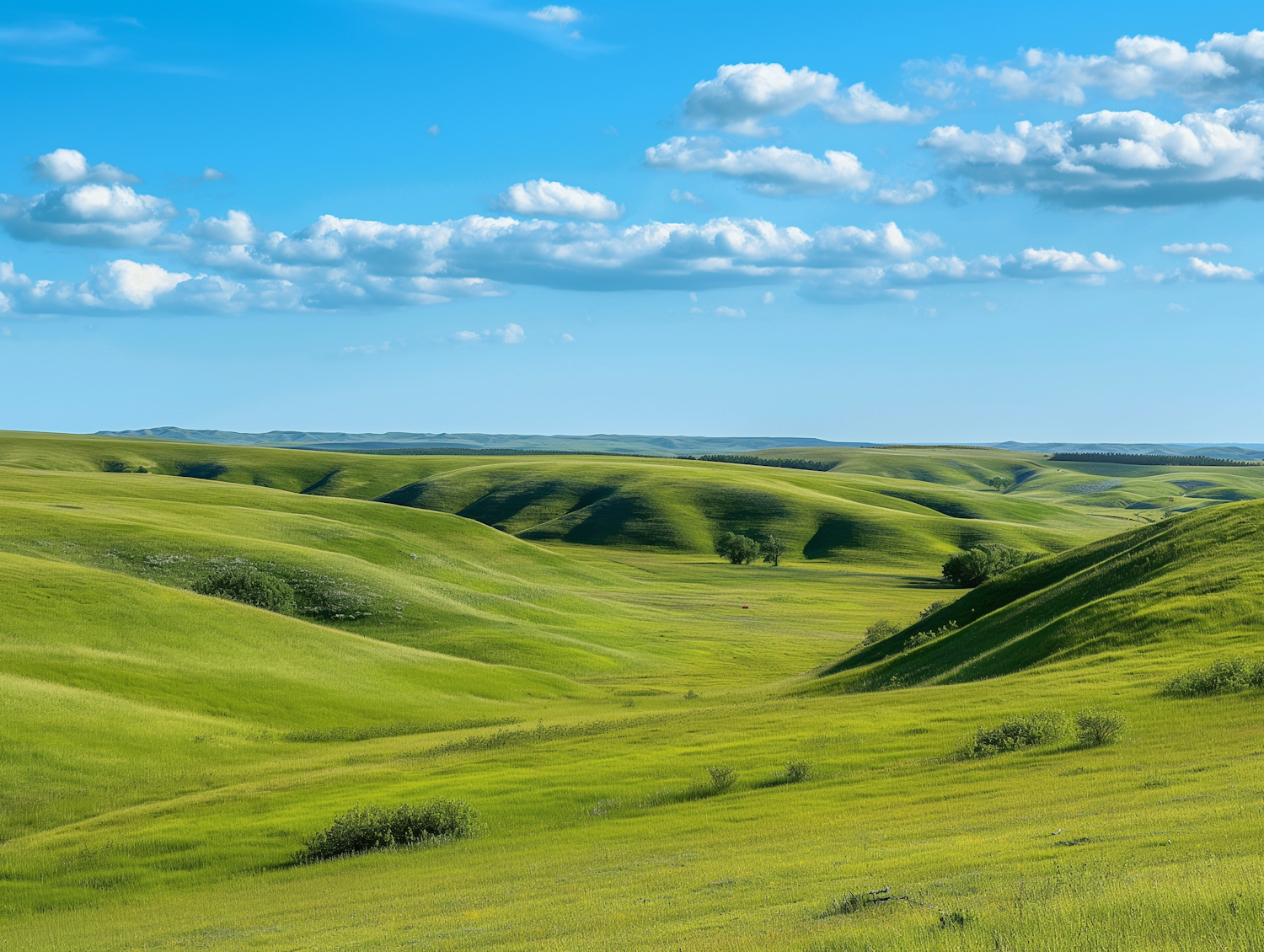 Explore the serene beauty of rolling green hills under a bright blue sky with fluffy clouds, capturing nature's tranquility and charm.