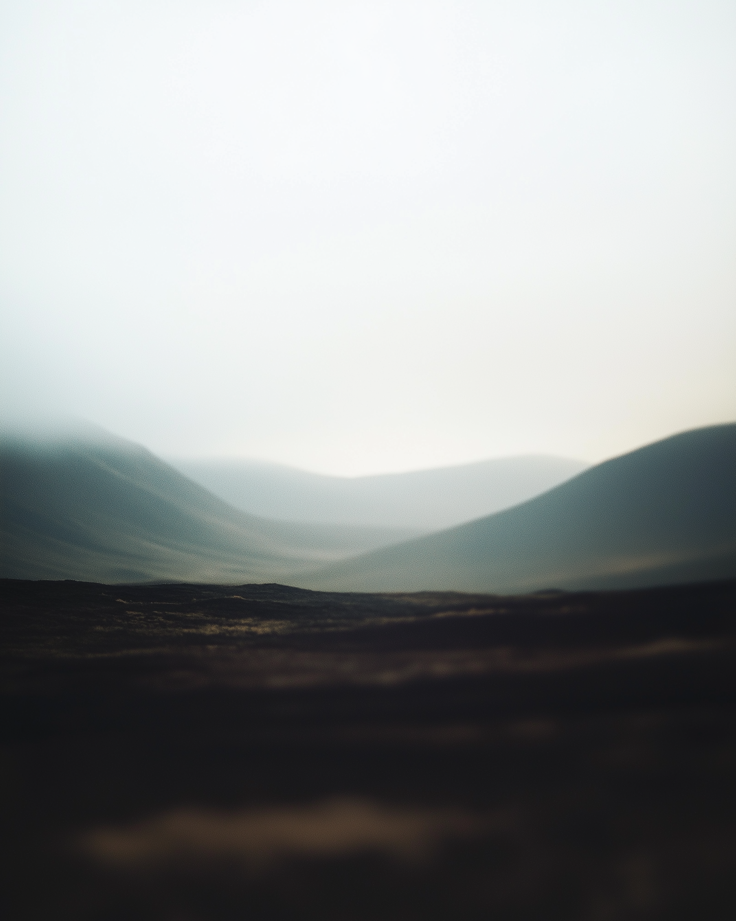 A tranquil landscape of misty hills fading into the horizon under a pale, overcast sky. Soft gradients and muted tones create a serene vibe.