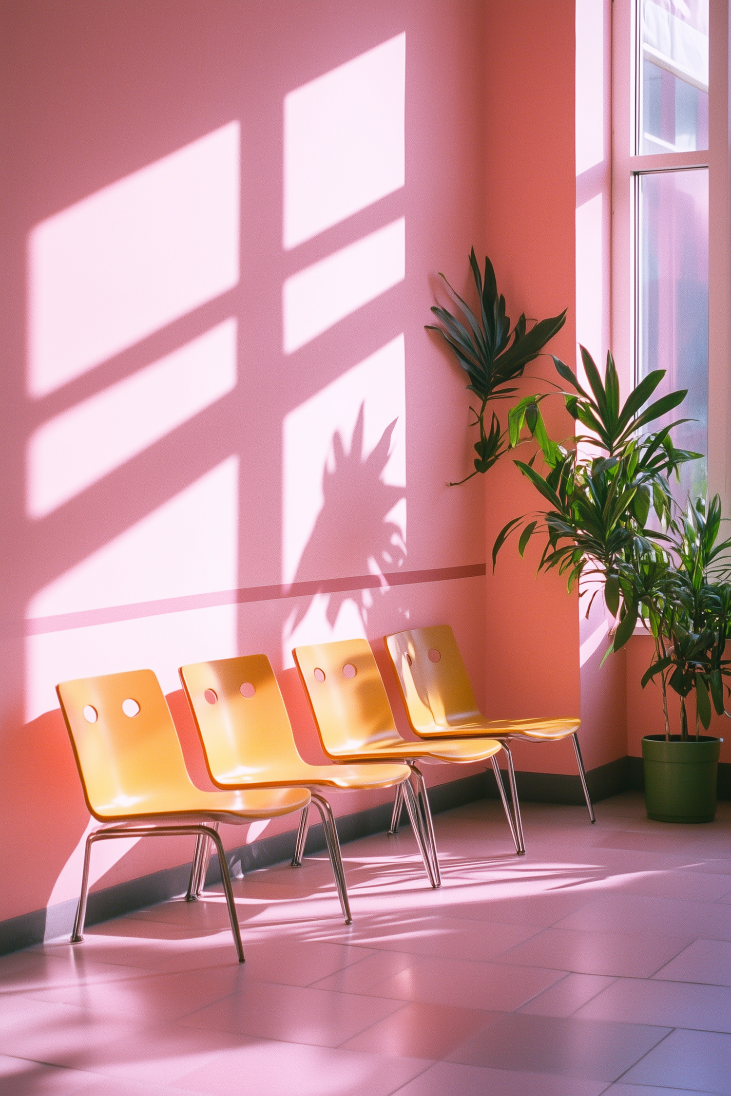 Bright room with yellow chairs, pink walls, and lush green plants. Sunlight casts geometric shadows, creating a modern, inviting space.