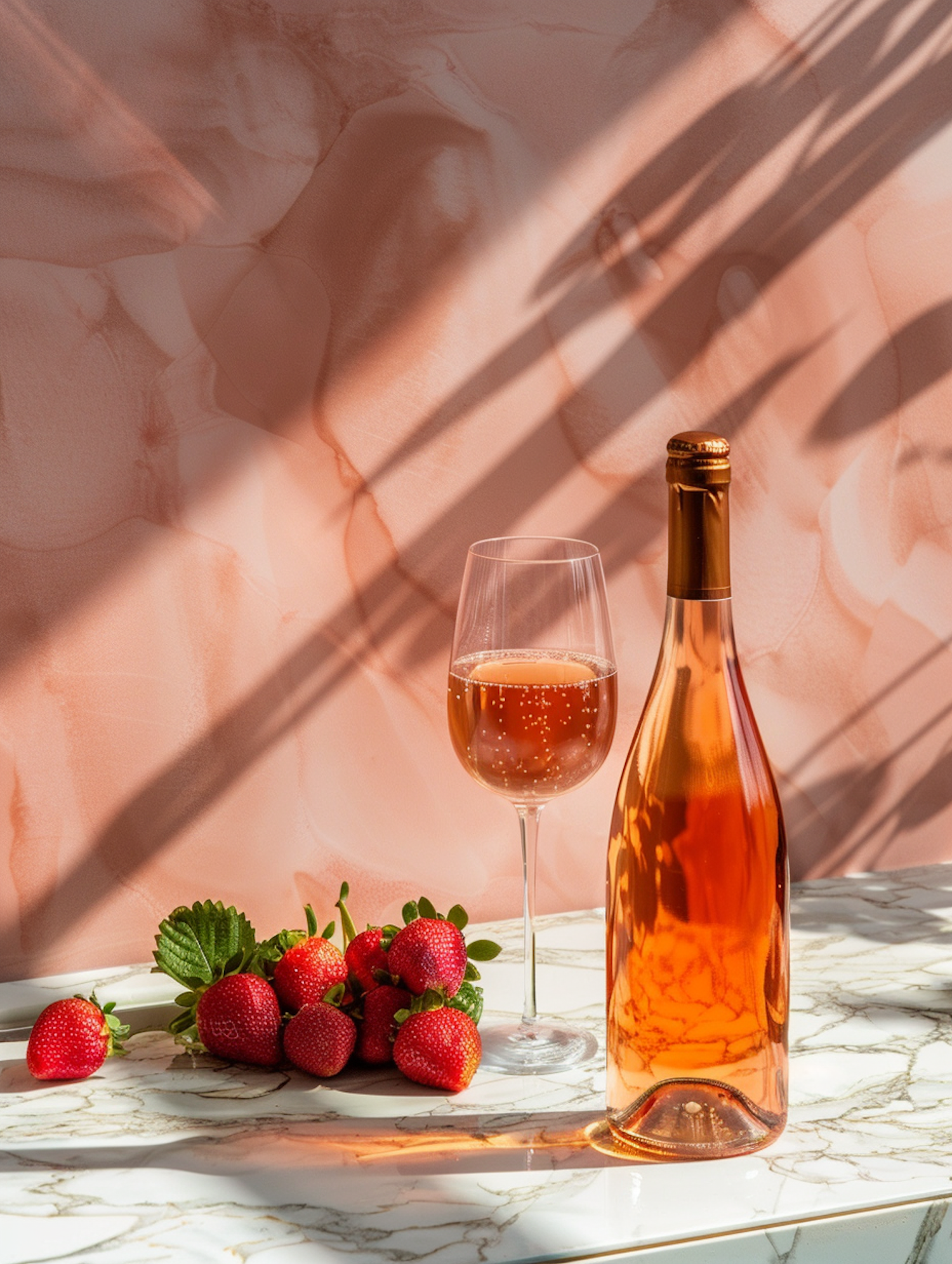 Rosé wine bottle and glass with strawberries on marble, set against a peach wall with artistic shadows.