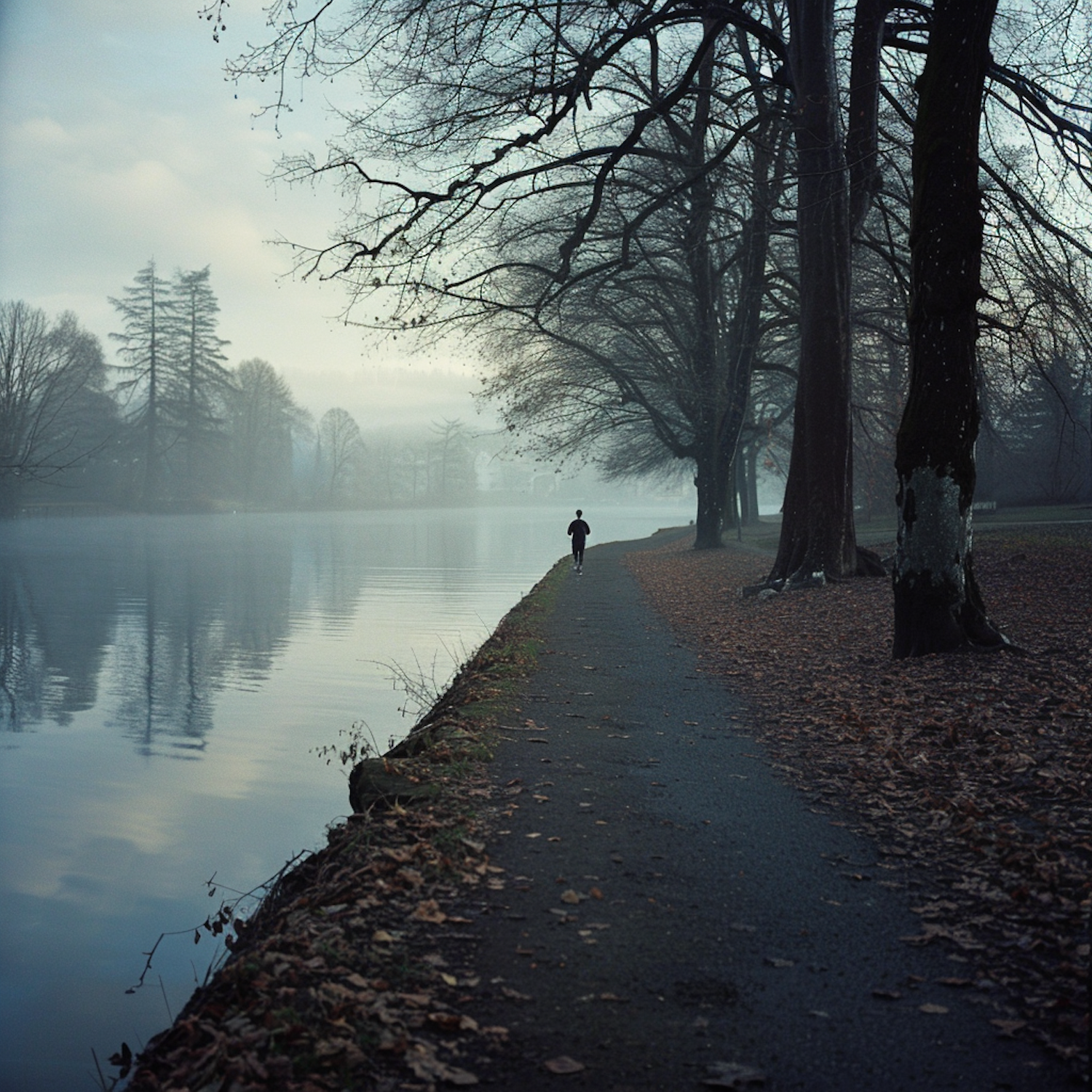 A lone jogger runs along a misty riverside path lined with bare trees, creating a serene and introspective autumn scene.