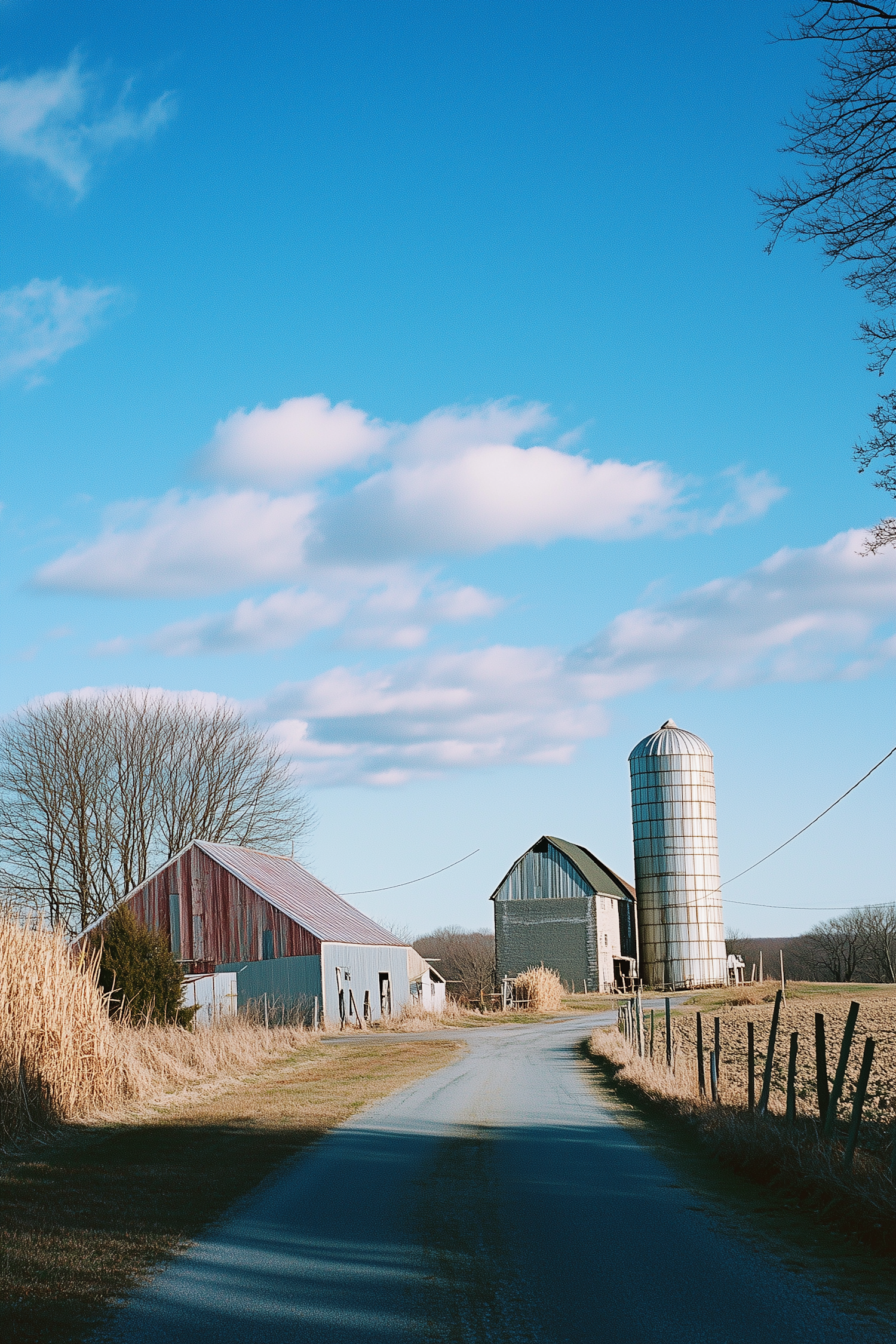 A peaceful rural road leads to a farm with a barn, silo, and open fields under a bright blue sky with fluffy clouds.