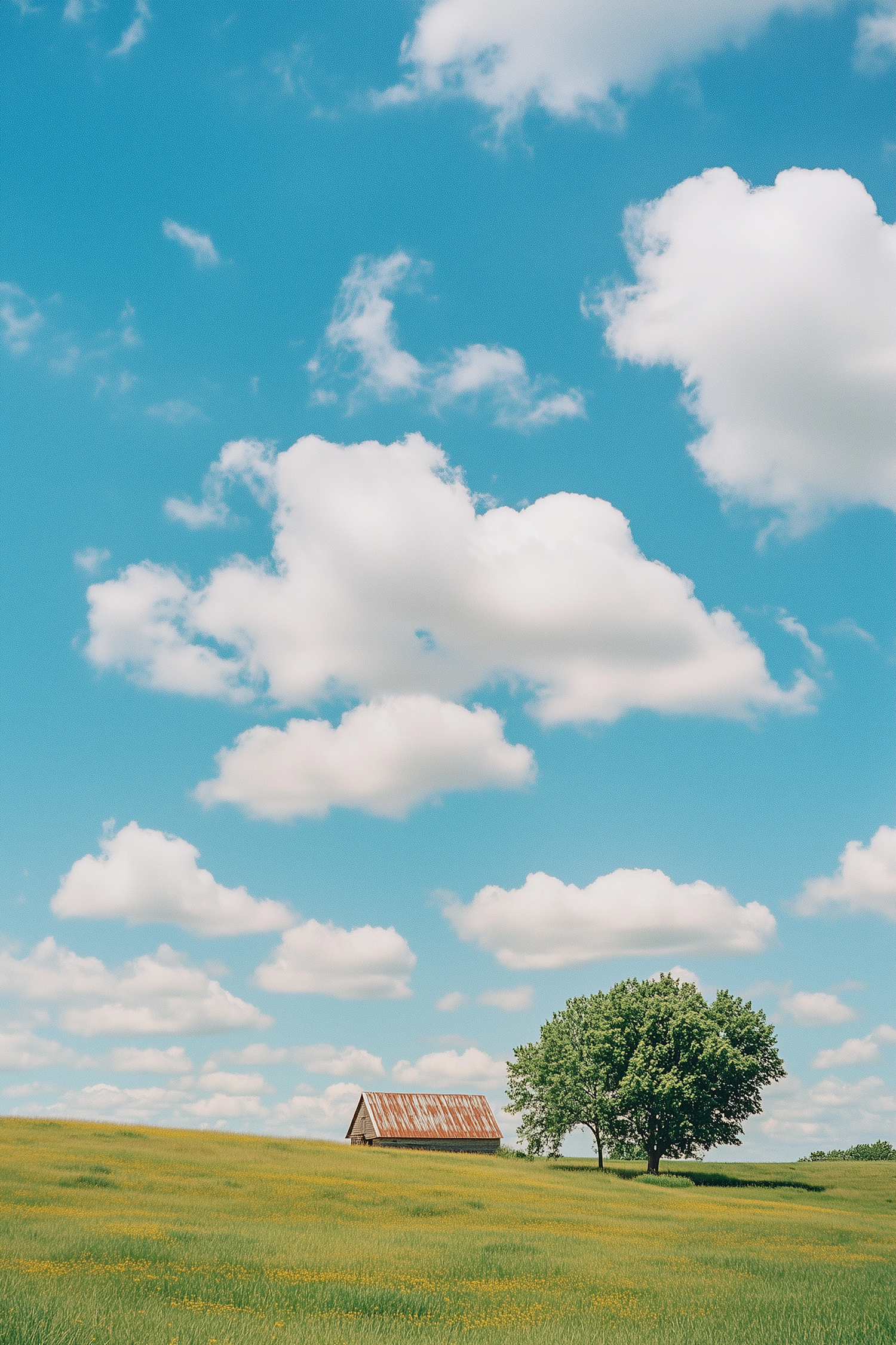 Peaceful countryside scene with a barn, green field, yellow wildflowers, and a bright blue sky with fluffy white clouds.