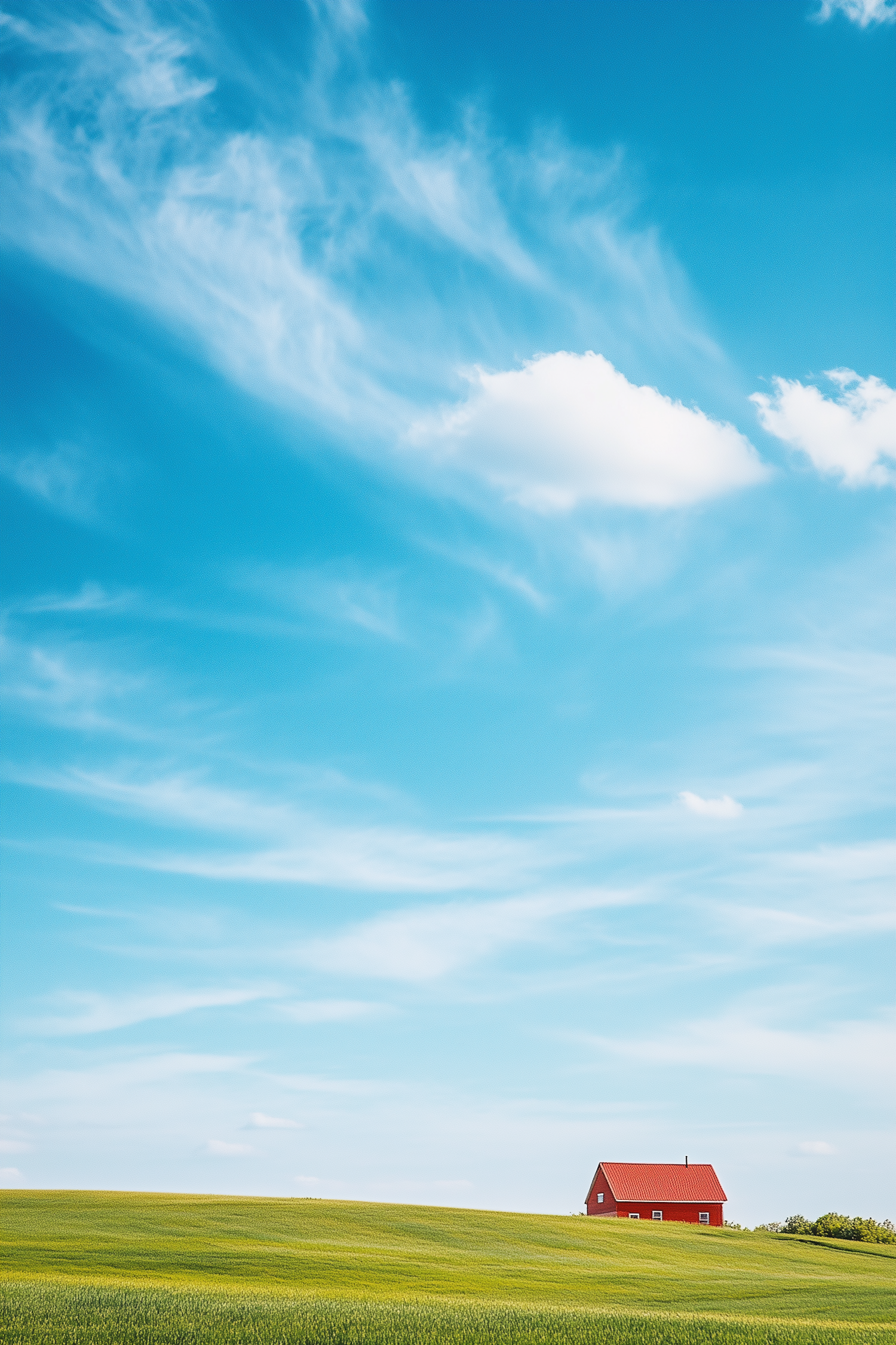 A peaceful countryside scene with a red barn on green fields under a vast blue sky with wispy clouds.