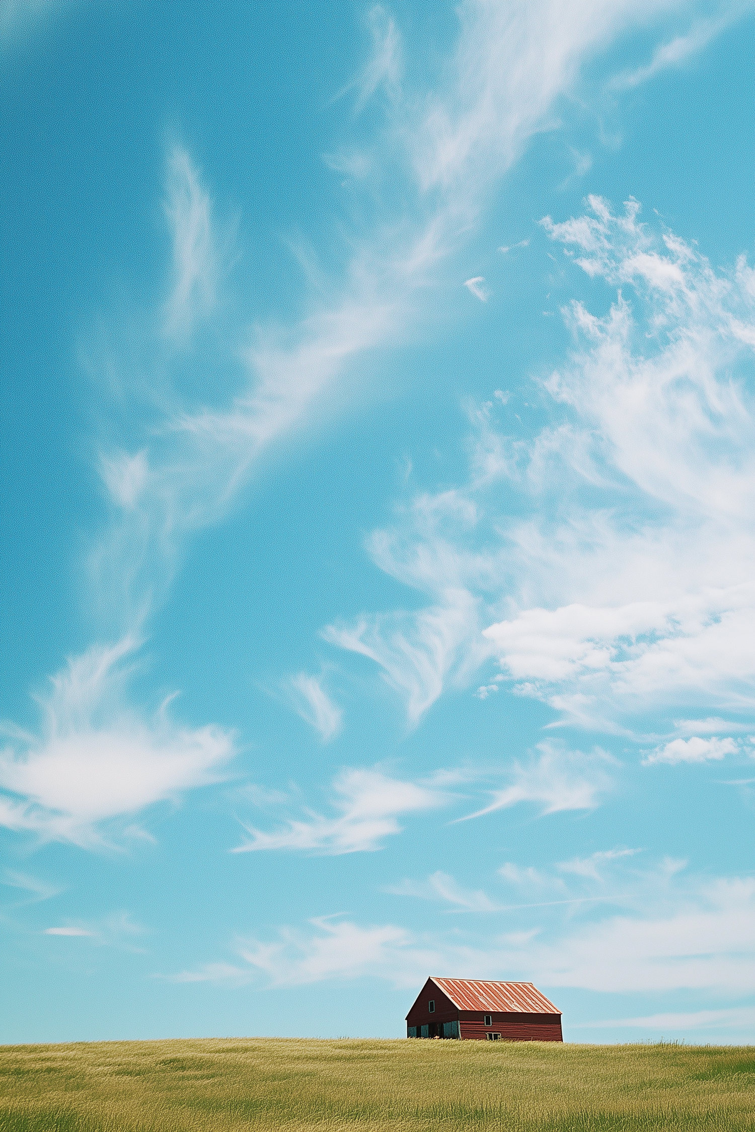 A red barn with a rusty roof sits in a golden field under a bright blue sky with wispy white clouds. Peaceful rural scenery.