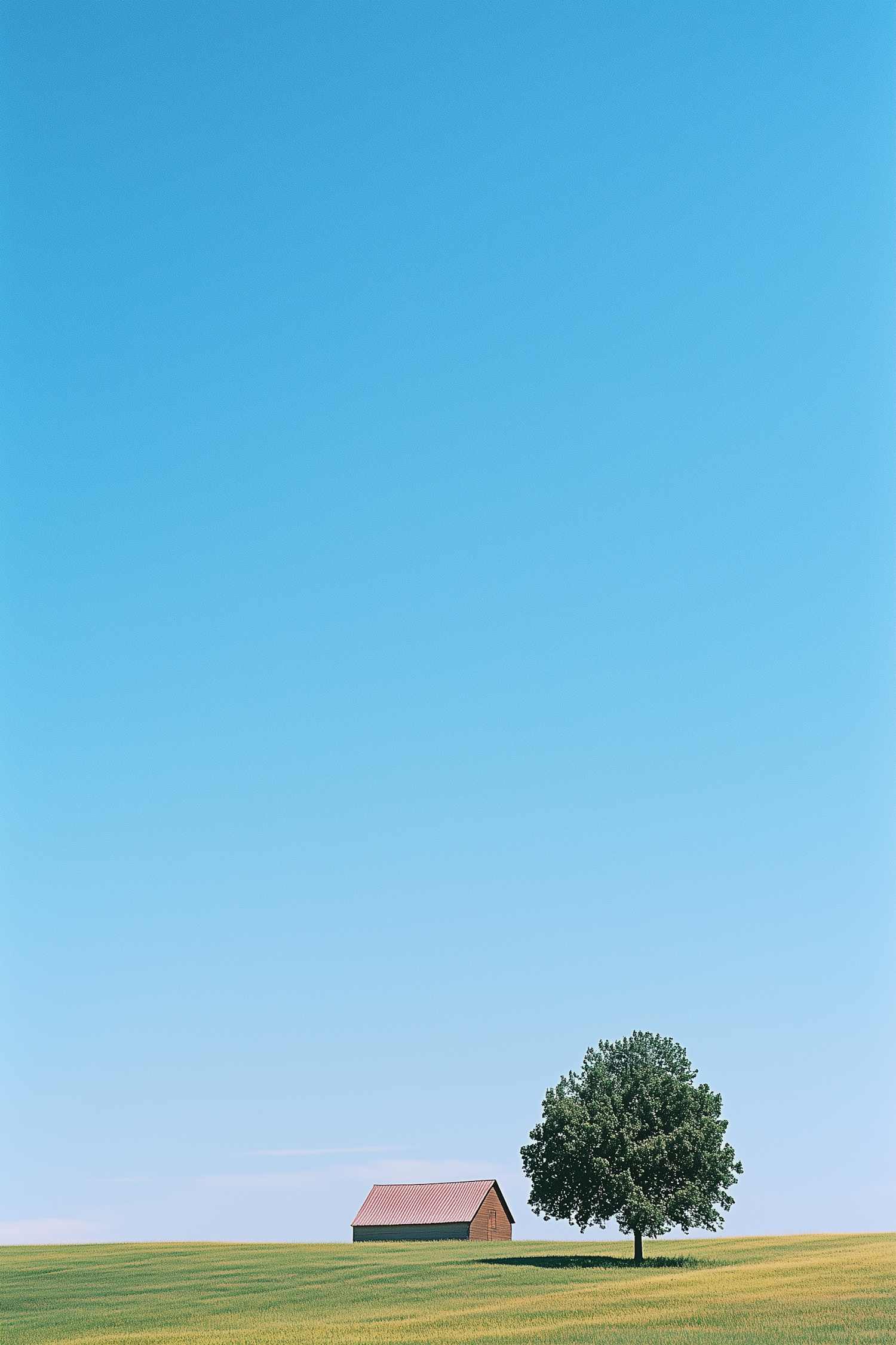 A peaceful rural scene with a barn, a lone tree, and a vast blue sky over a green and yellow field.
