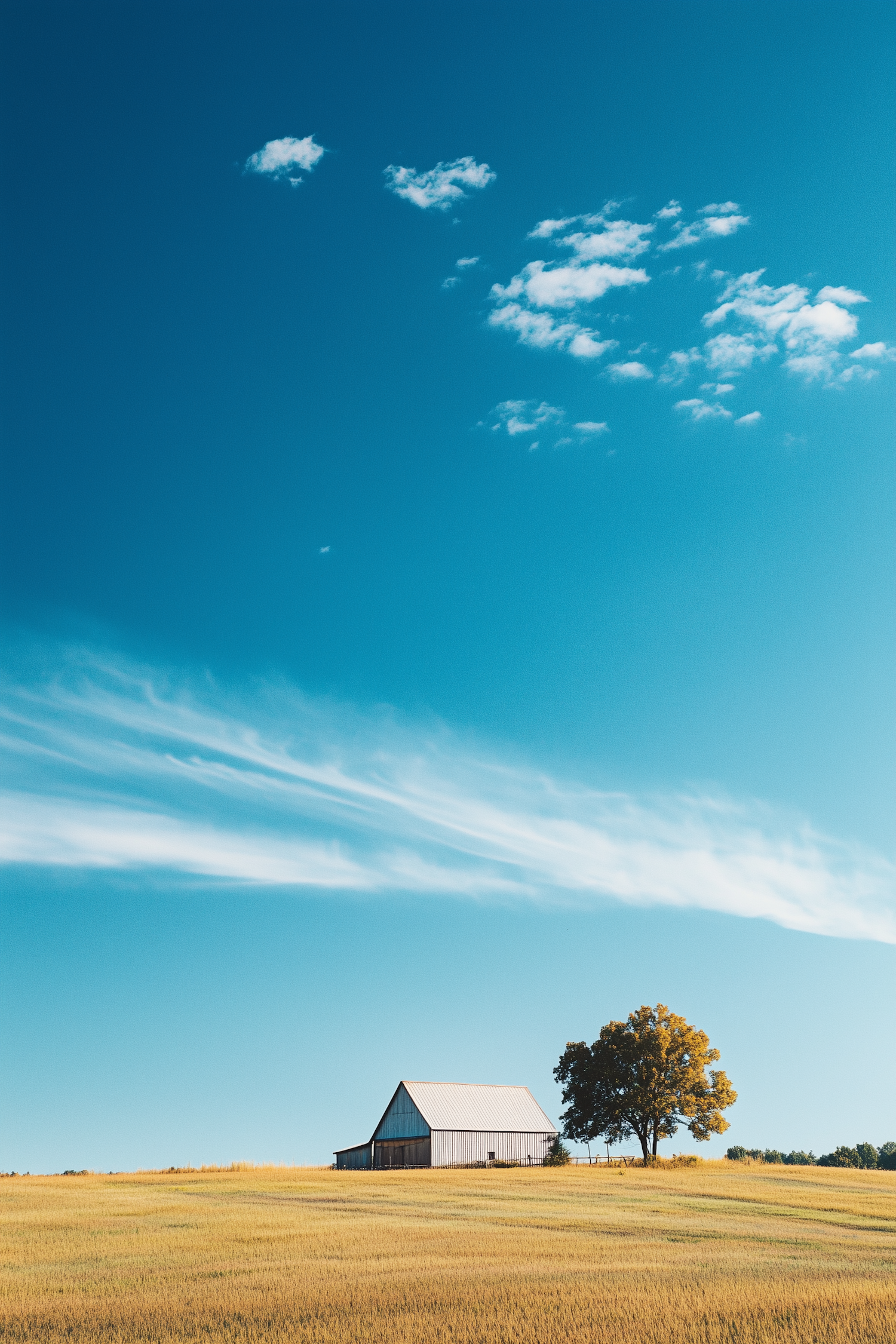 Peaceful rural scene with a barn, golden field, and vibrant blue sky with wispy clouds. Perfect for nature and countryside lovers.