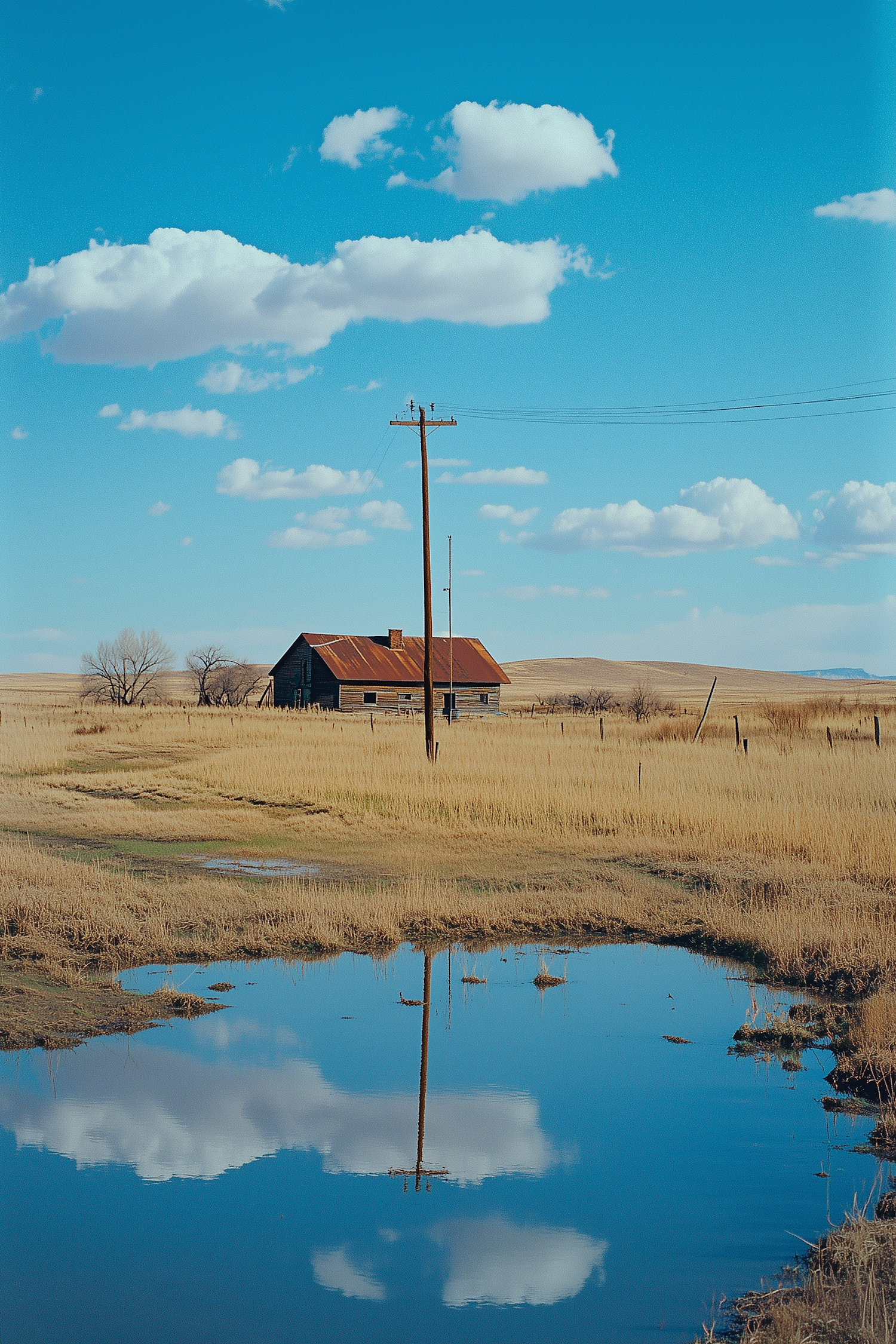 Rustic house with a rusted roof in a golden field, reflected in a pond under a bright blue sky with fluffy clouds.