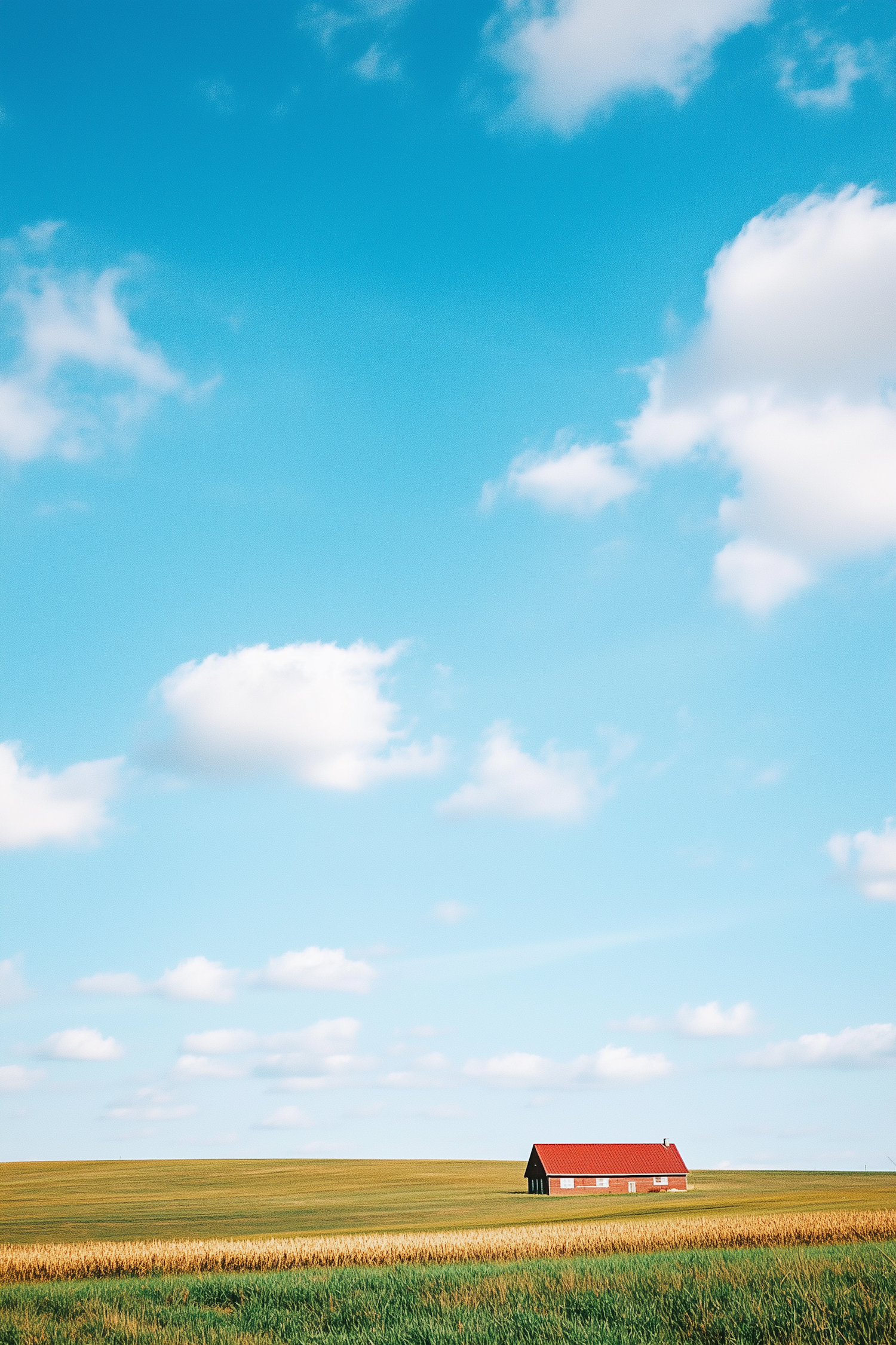 A peaceful countryside scene with a red-roofed barn in a golden field under a bright blue sky with fluffy clouds.