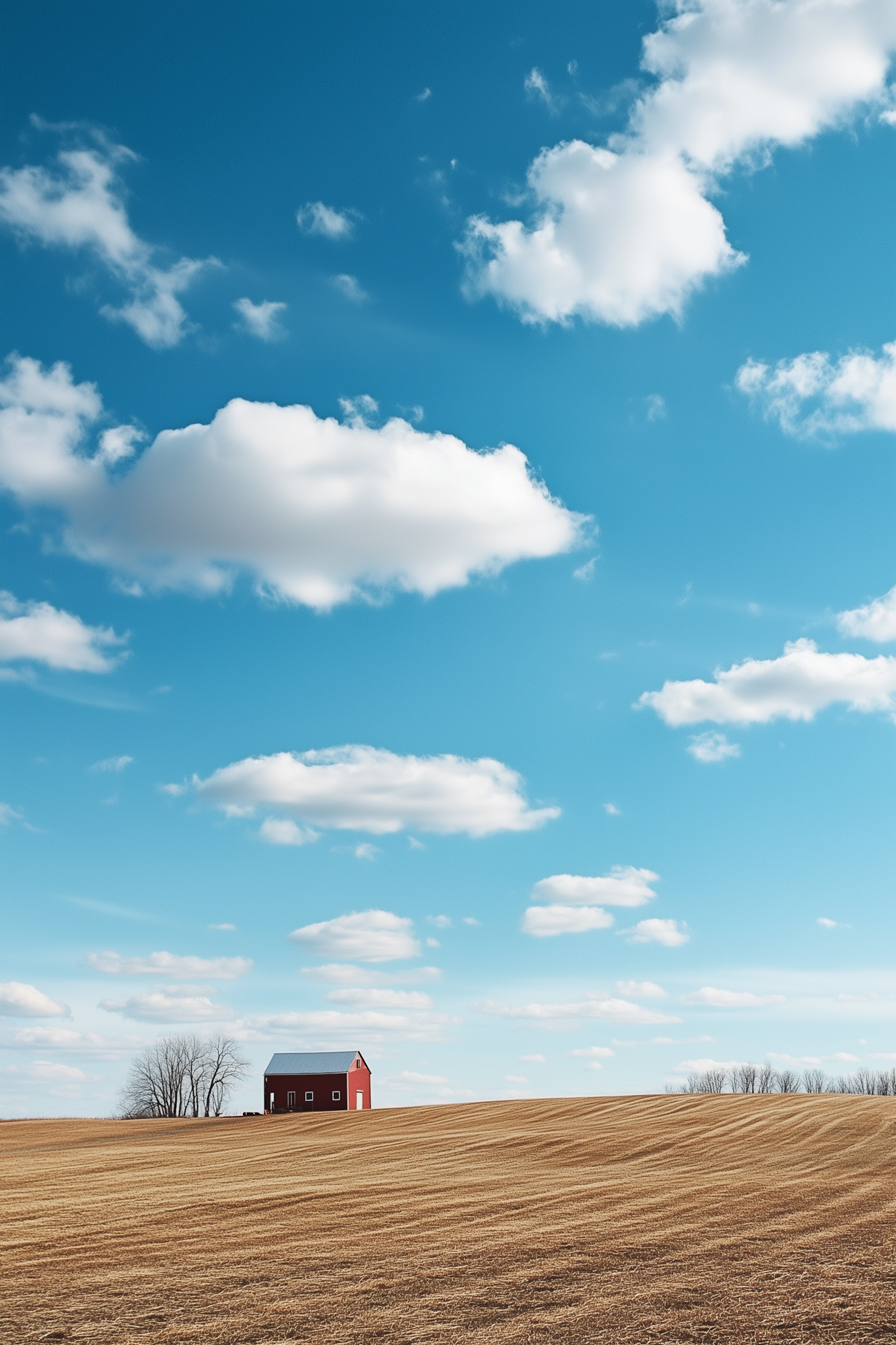 A red barn sits on a golden field under a bright blue sky with fluffy clouds, creating a peaceful rural scene.