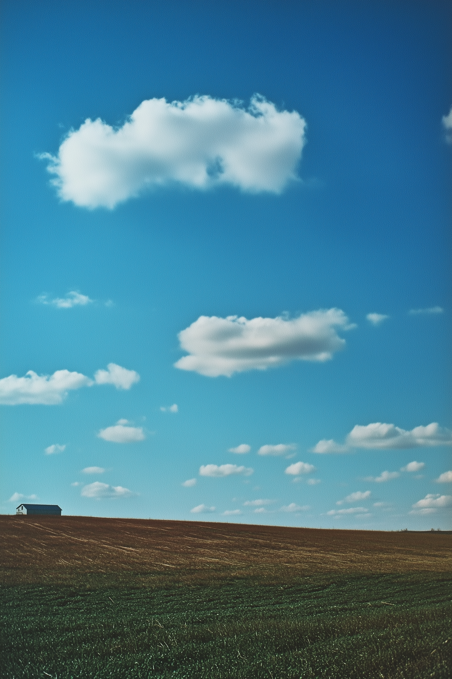 A peaceful rural scene with a barn on the horizon, vibrant blue sky, fluffy clouds, and a field of green and golden crops.