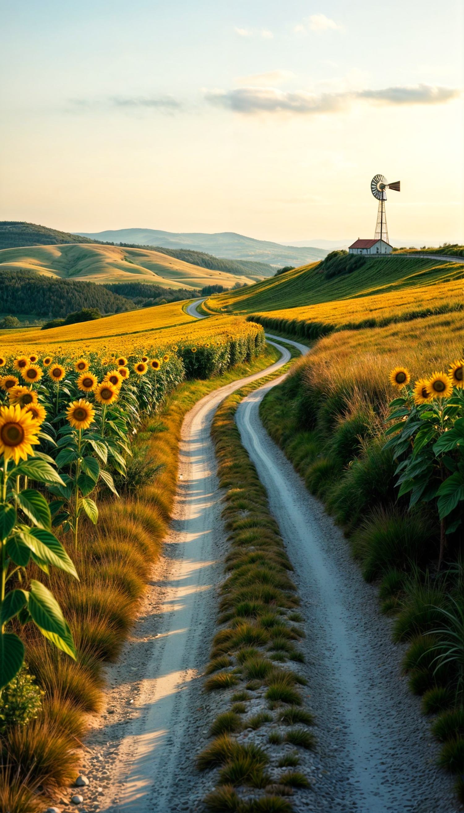 Winding dirt road through sunflower fields with a distant windmill under a golden sunset, evoking tranquility and natural beauty.