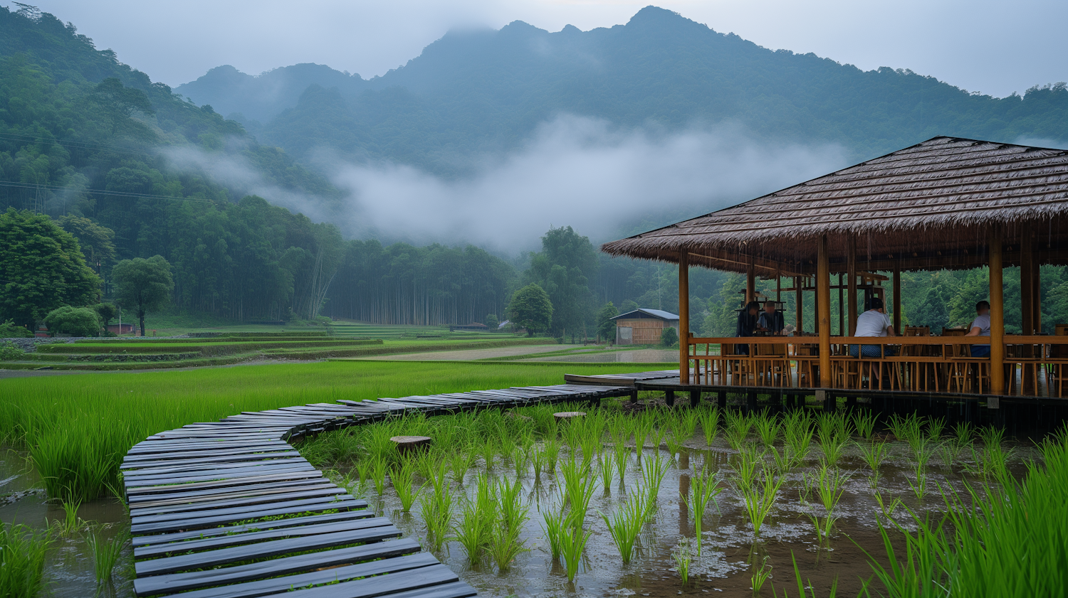 Serene rice paddies with a wooden path leading to a thatched pavilion, set against misty mountains and lush greenery.