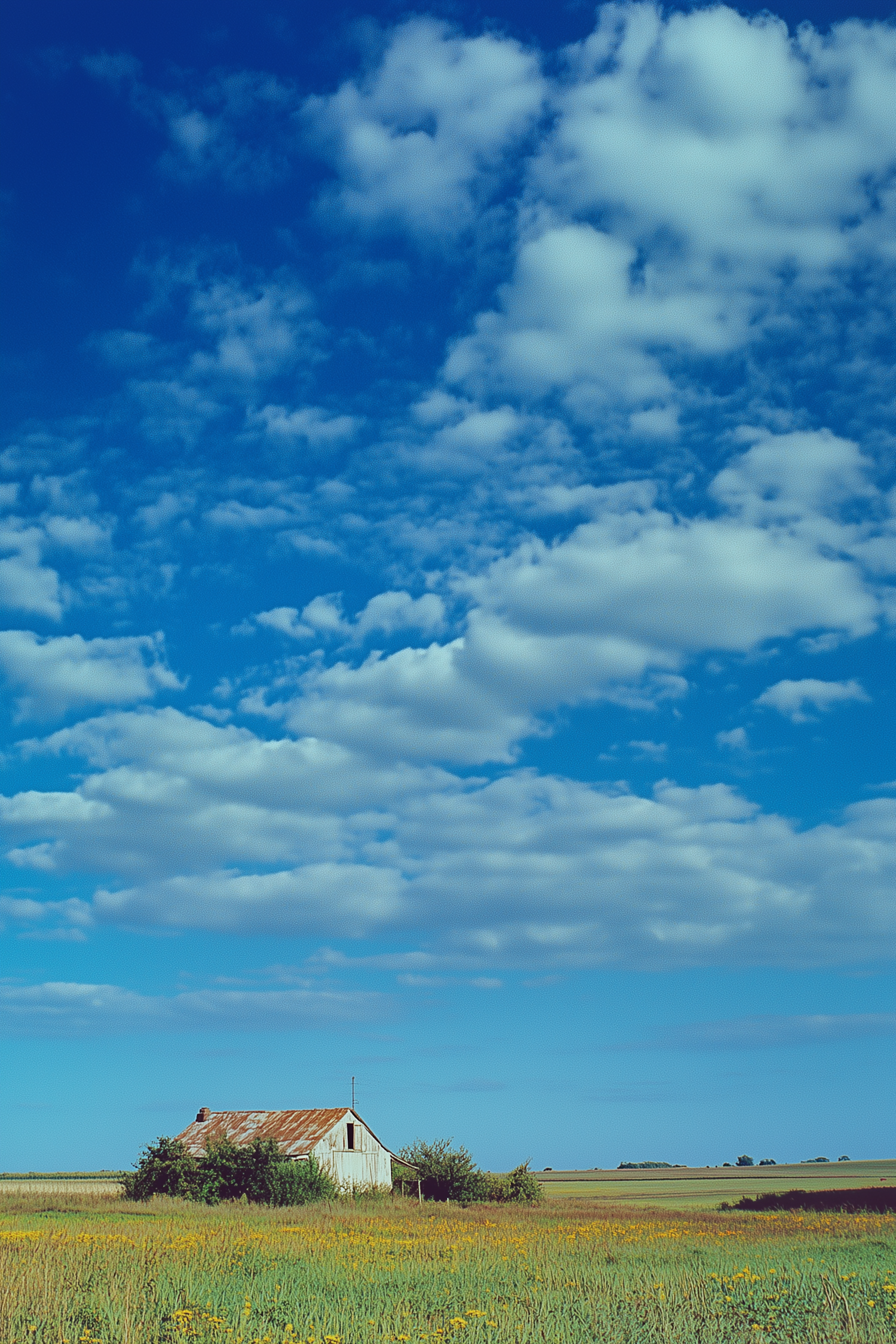 A rustic white barn with a rusted roof sits in a field of green grass and yellow wildflowers under a bright blue sky with fluffy clouds.