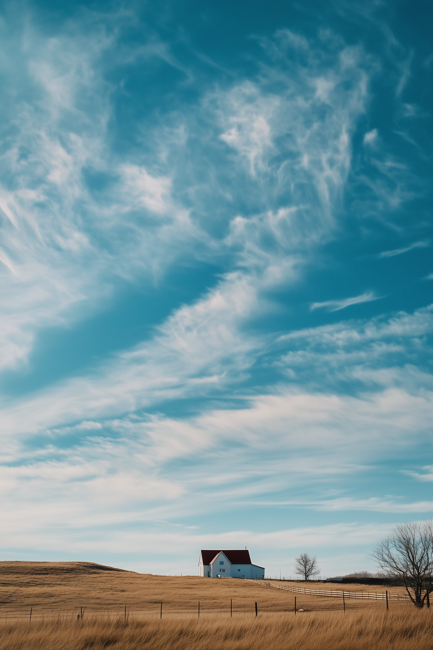 A peaceful countryside scene with a white house, golden fields, and a vibrant blue sky filled with wispy clouds.