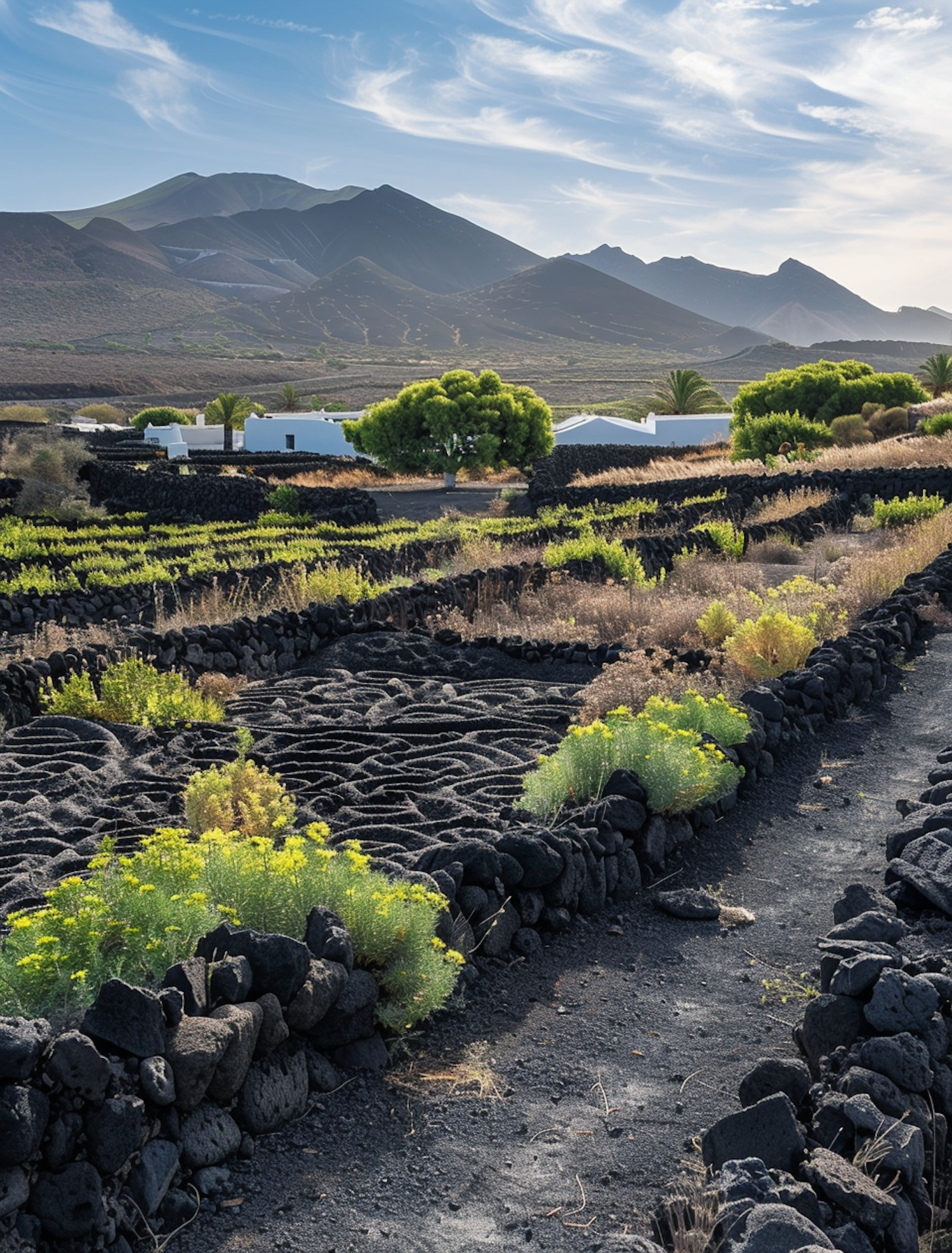 Terraced fields with volcanic rock walls and vibrant vegetation under a clear sky, set against a mountainous backdrop.