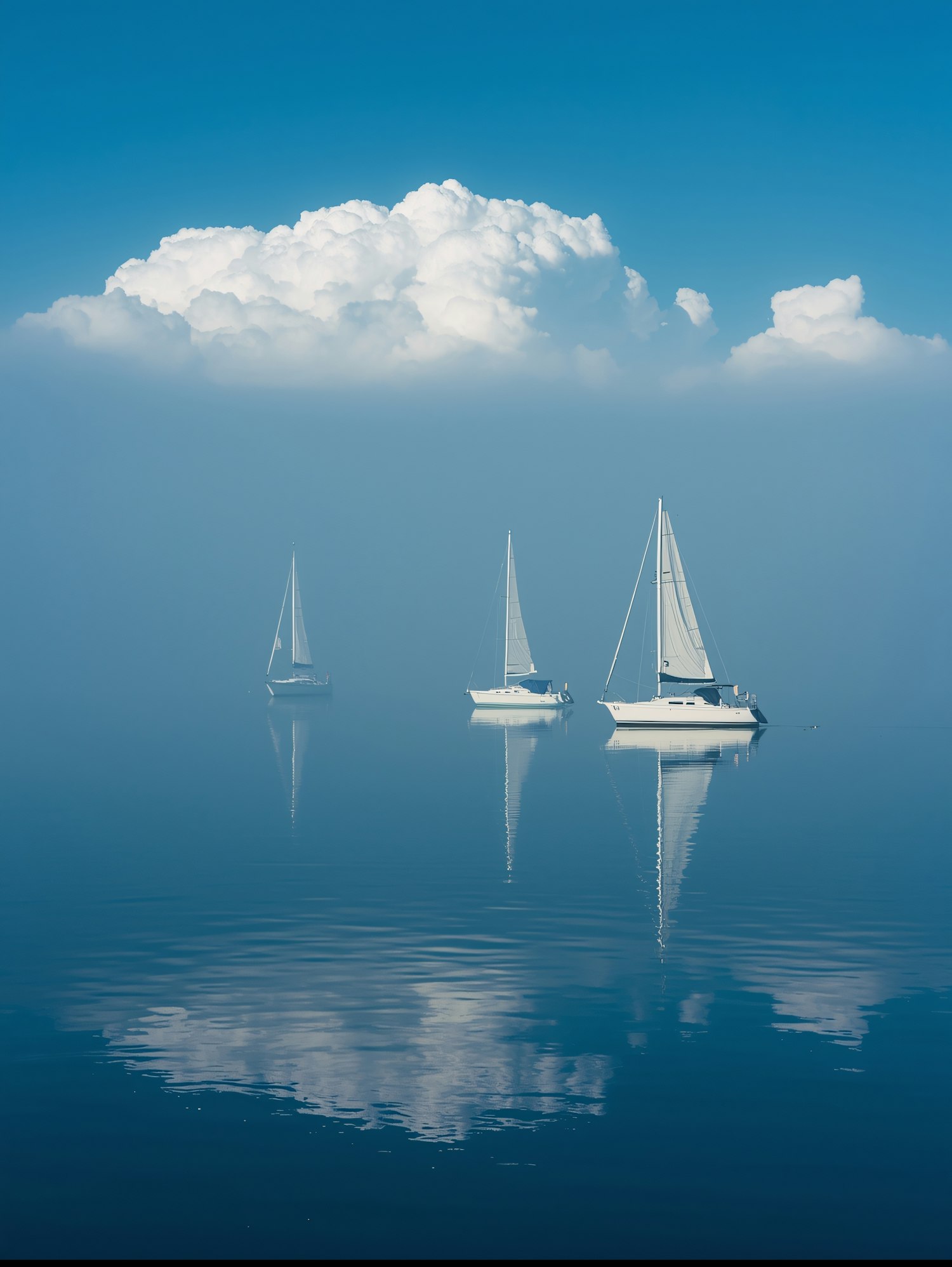 Three sailboats on a calm, reflective lake under a clear blue sky with a large white cloud. A serene and peaceful scene.