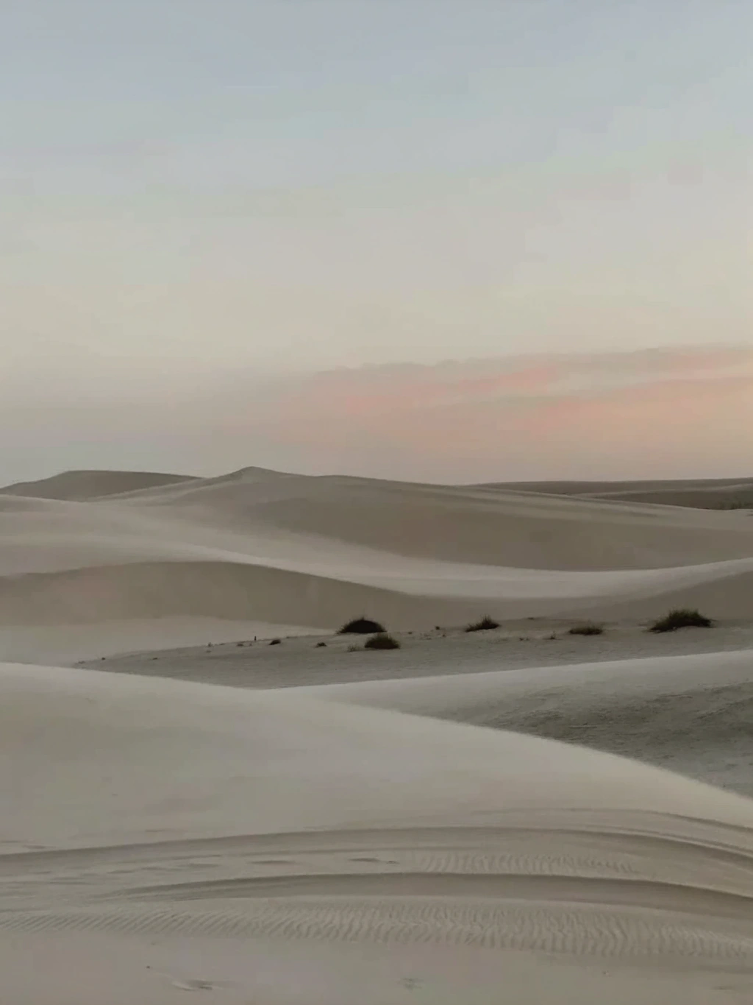 Serene sand dunes with soft beige tones, sparse vegetation, and a pastel sky at dawn or dusk, creating a tranquil desert landscape.