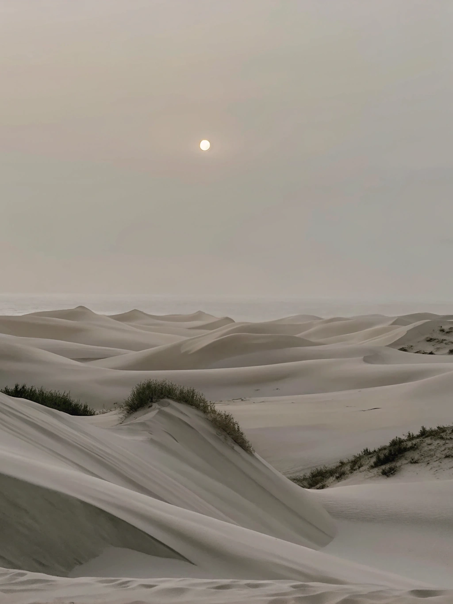 Serene sand dunes under a hazy sun, with soft curves and sparse vegetation creating a tranquil, otherworldly desert landscape.