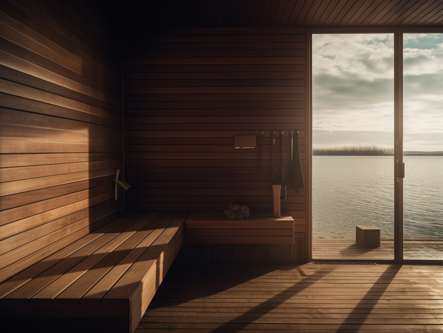 Tranquil sauna interior with wooden paneling, overlooking a serene lake through a large glass door. Warm, inviting atmosphere.