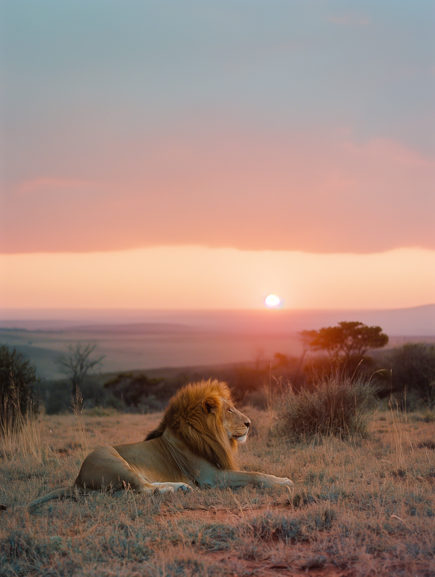 Majestic lion resting on the savannah at sunset, with a golden mane and serene posture, under a warm, colorful sky.