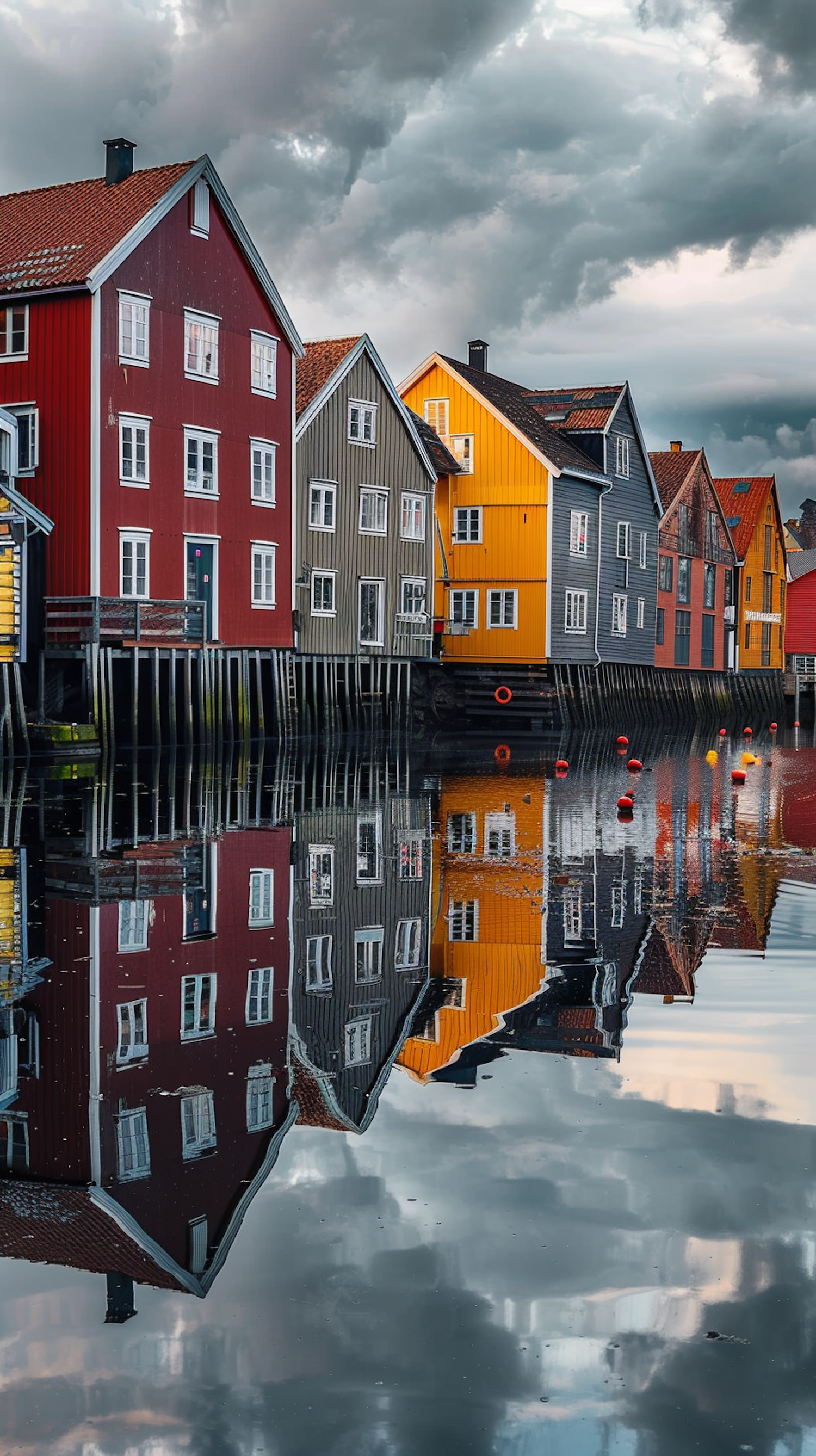 Colorful wooden houses reflect in calm water under a dramatic cloudy sky, creating a serene and symmetrical scene.
