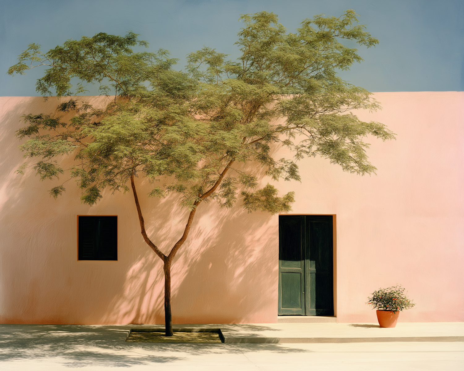 Pastel pink wall with a green door, tree casting shadows, and a terracotta pot under a clear blue sky.