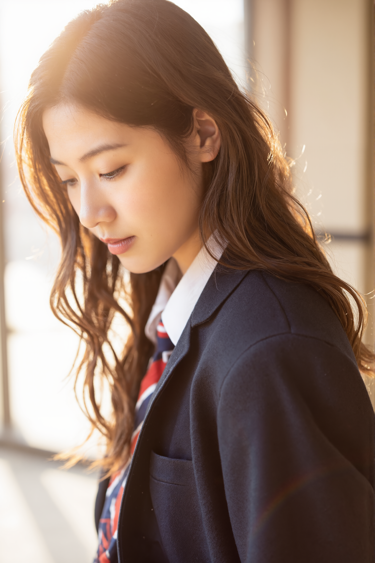 A serene portrait of a young woman in a school uniform, bathed in warm sunlight with a calm, introspective expression.