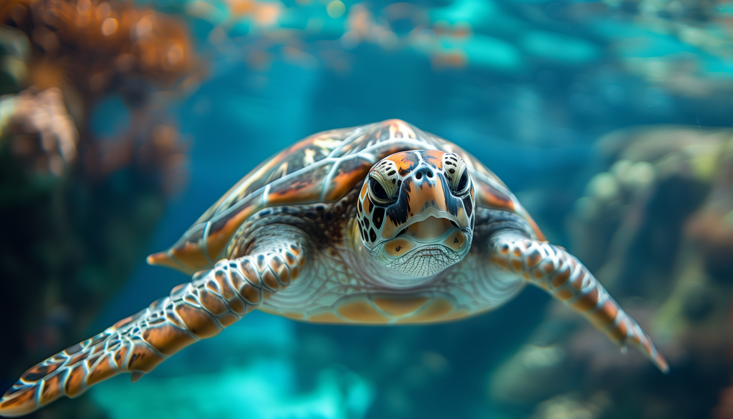 A sea turtle glides through clear blue waters, showcasing its intricate shell patterns and serene expression in a vibrant underwater scene.