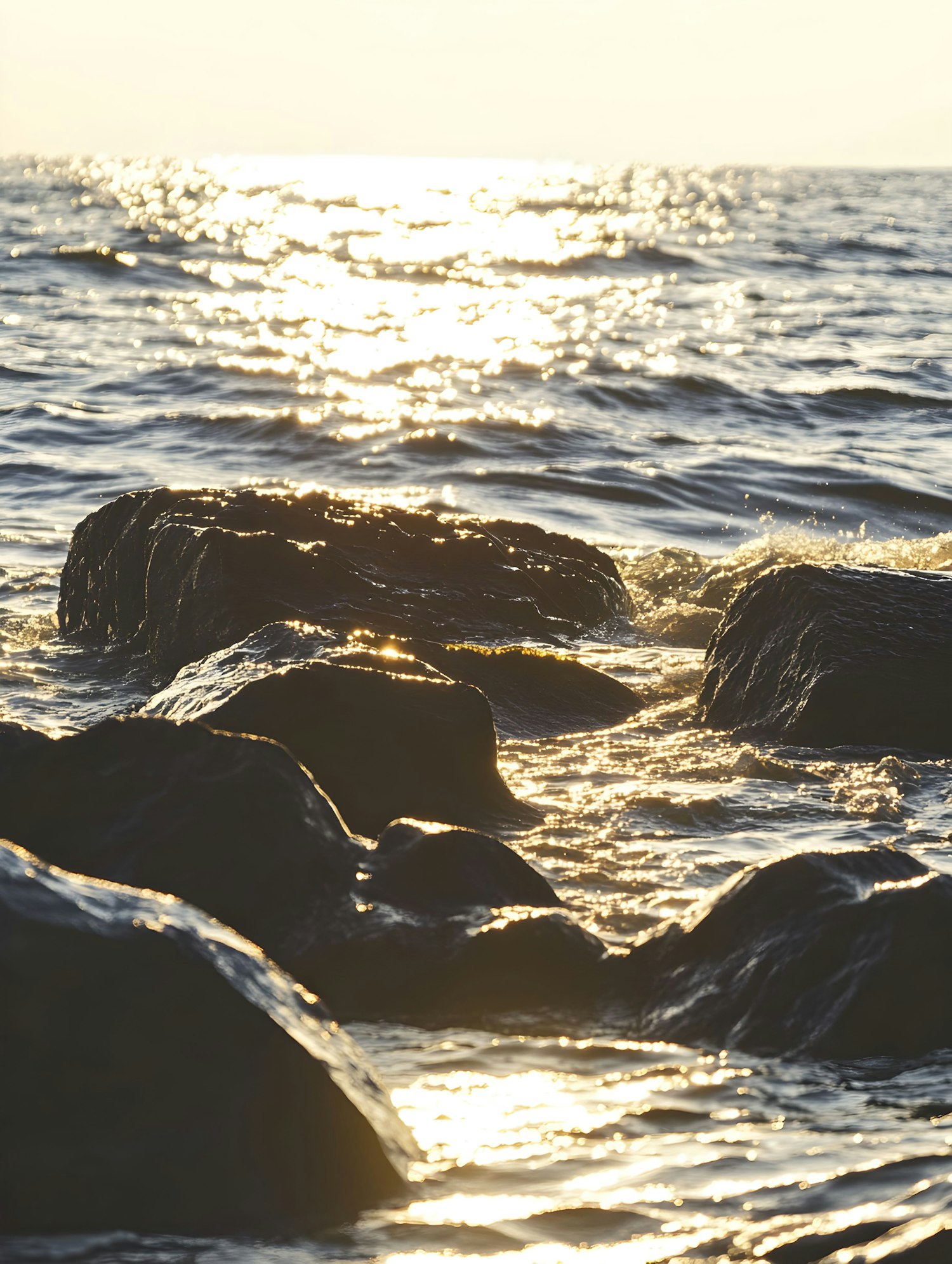 Golden sunlight reflects on a tranquil sea with glistening rocks, creating a serene and picturesque coastal scene.