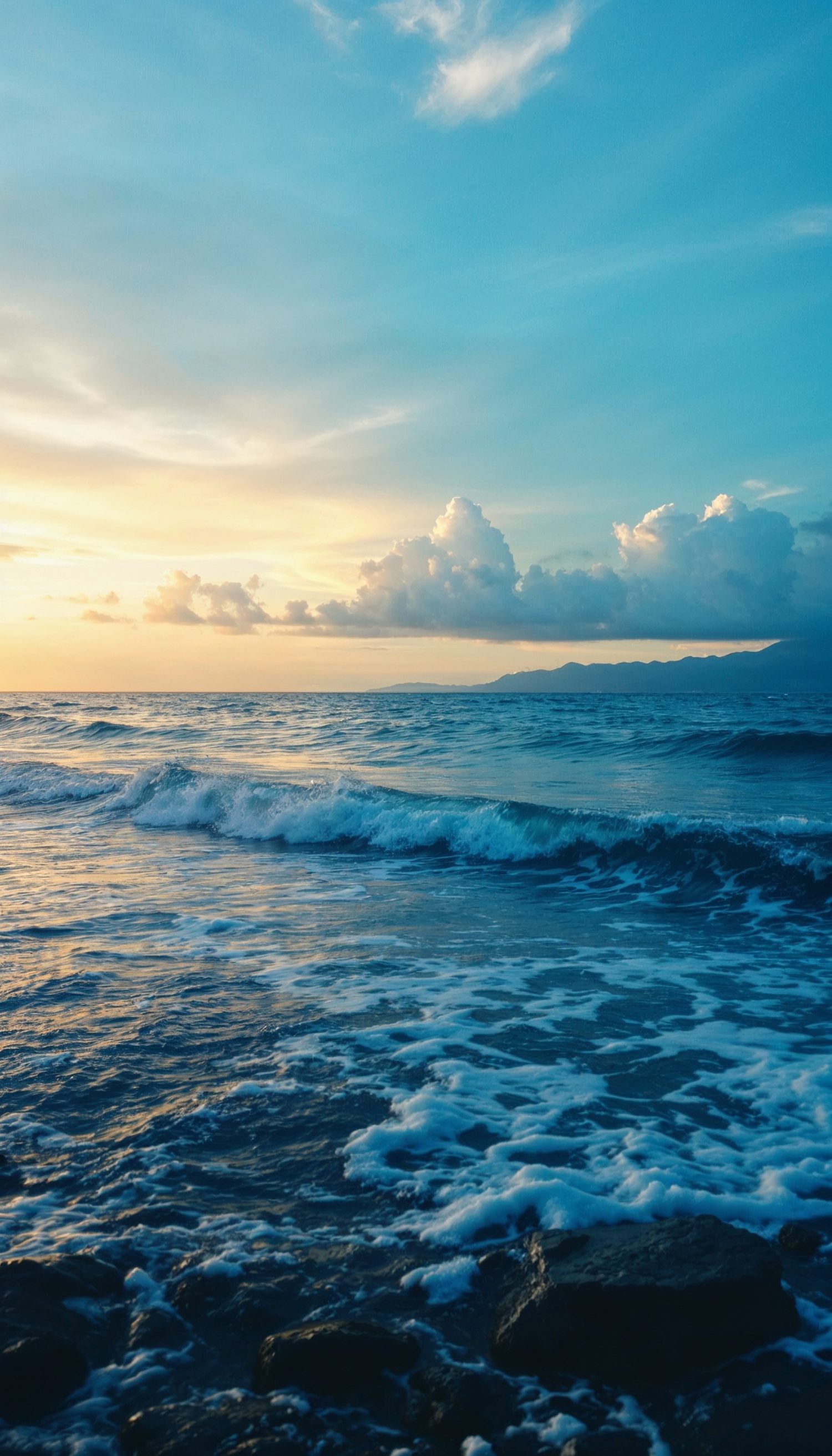 Serene ocean sunset with waves, golden sky, and distant mountains. Perfect for nature lovers and sunset enthusiasts.