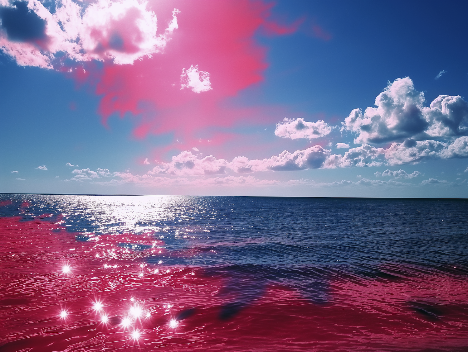Vibrant seascape with pink sky and water, dazzling sun reflections, and fluffy clouds creating a surreal, captivating scene.