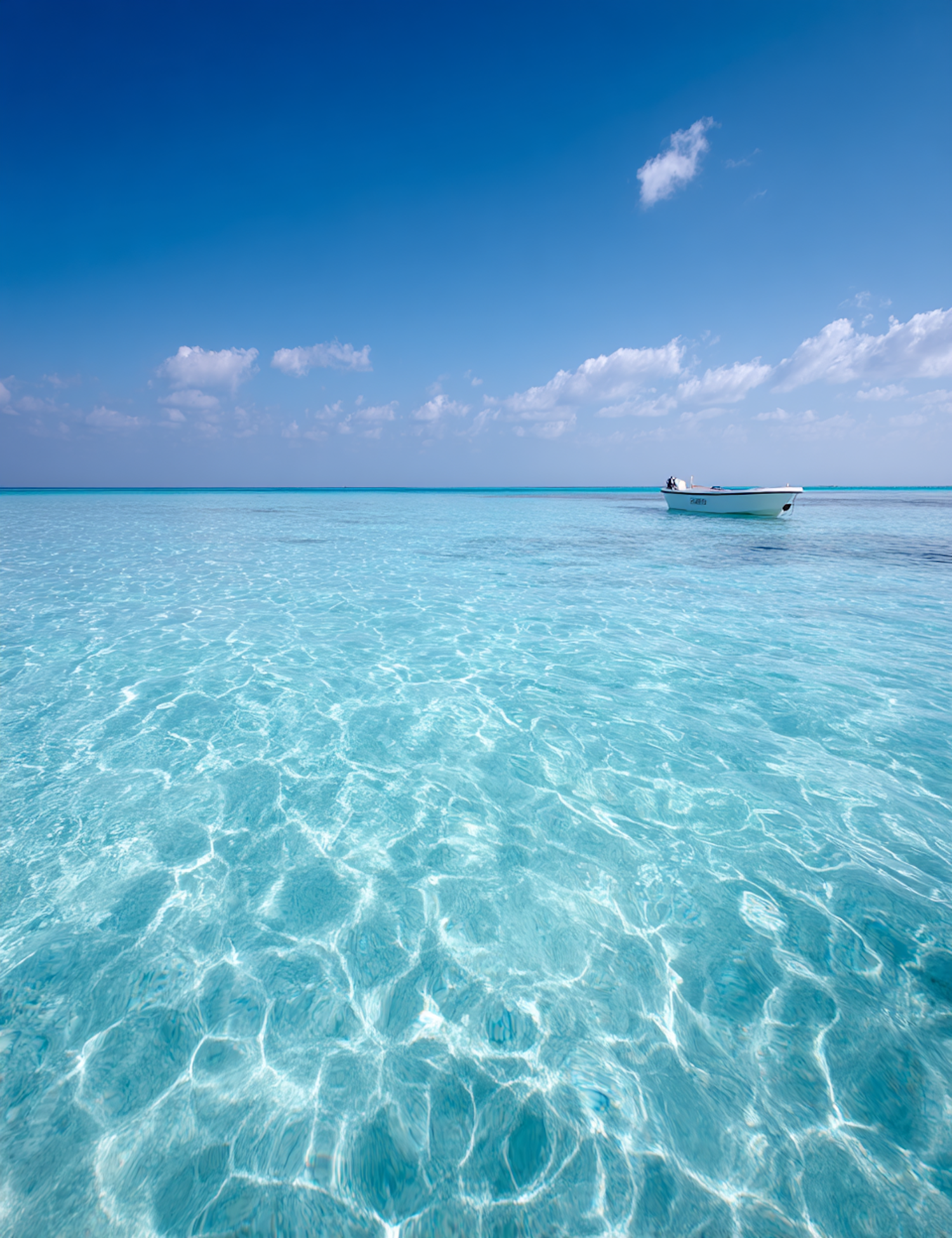 Crystal-clear turquoise waters under a bright blue sky with a small white boat floating in the distance. A perfect tropical escape.
