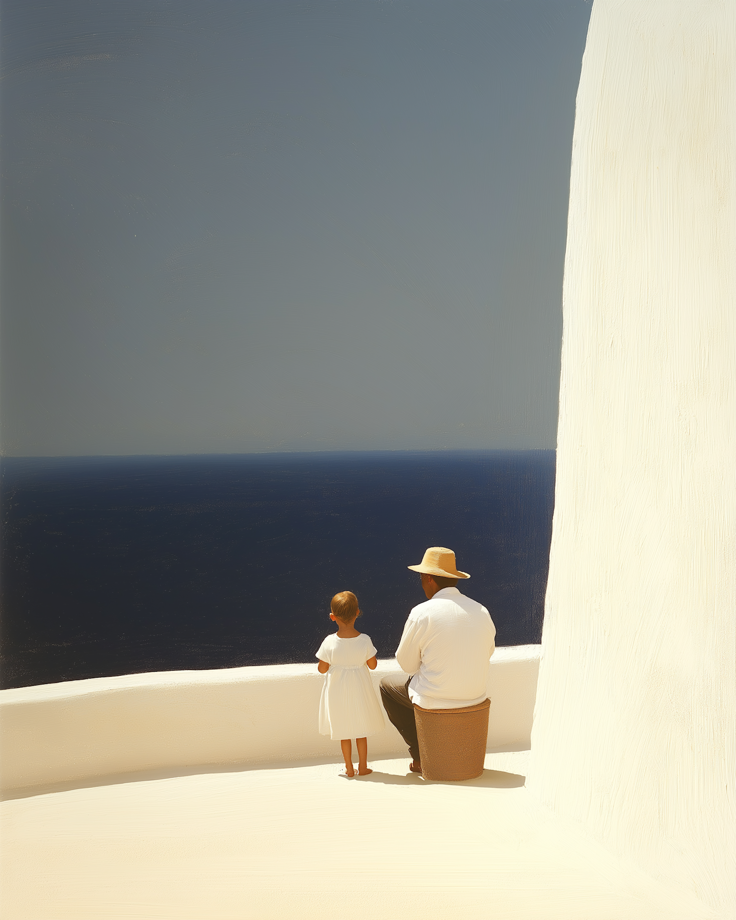 A man and child in white attire gaze at the deep blue sea from a sunlit terrace, evoking tranquility and connection with nature.