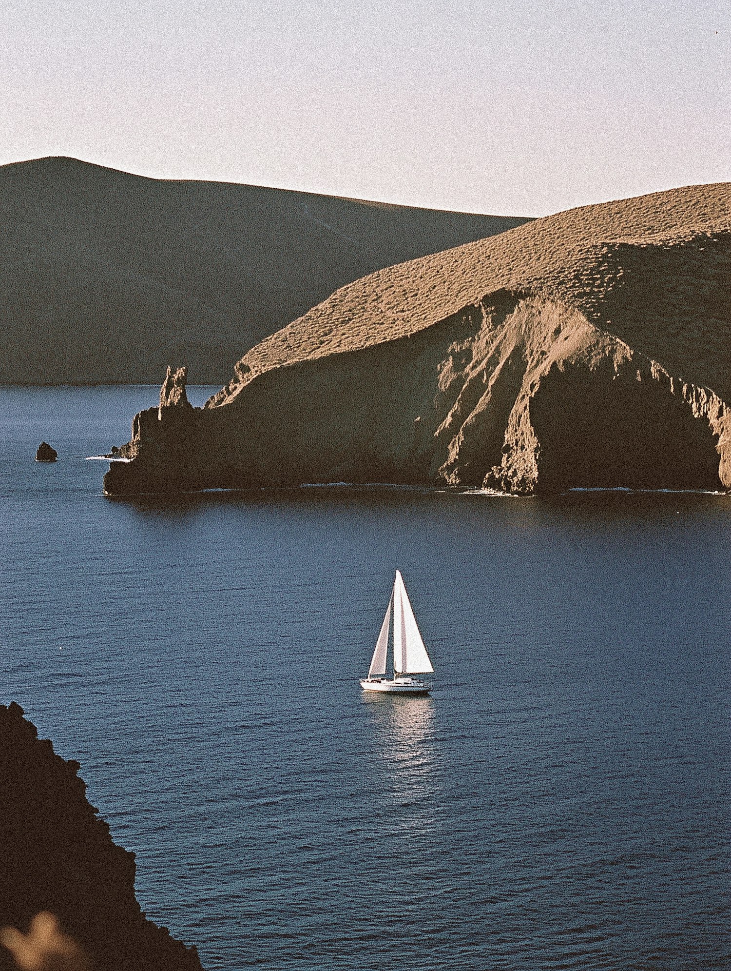 A sailboat with white sails glides on deep blue water, framed by rugged cliffs under a clear sky, creating a tranquil scene.