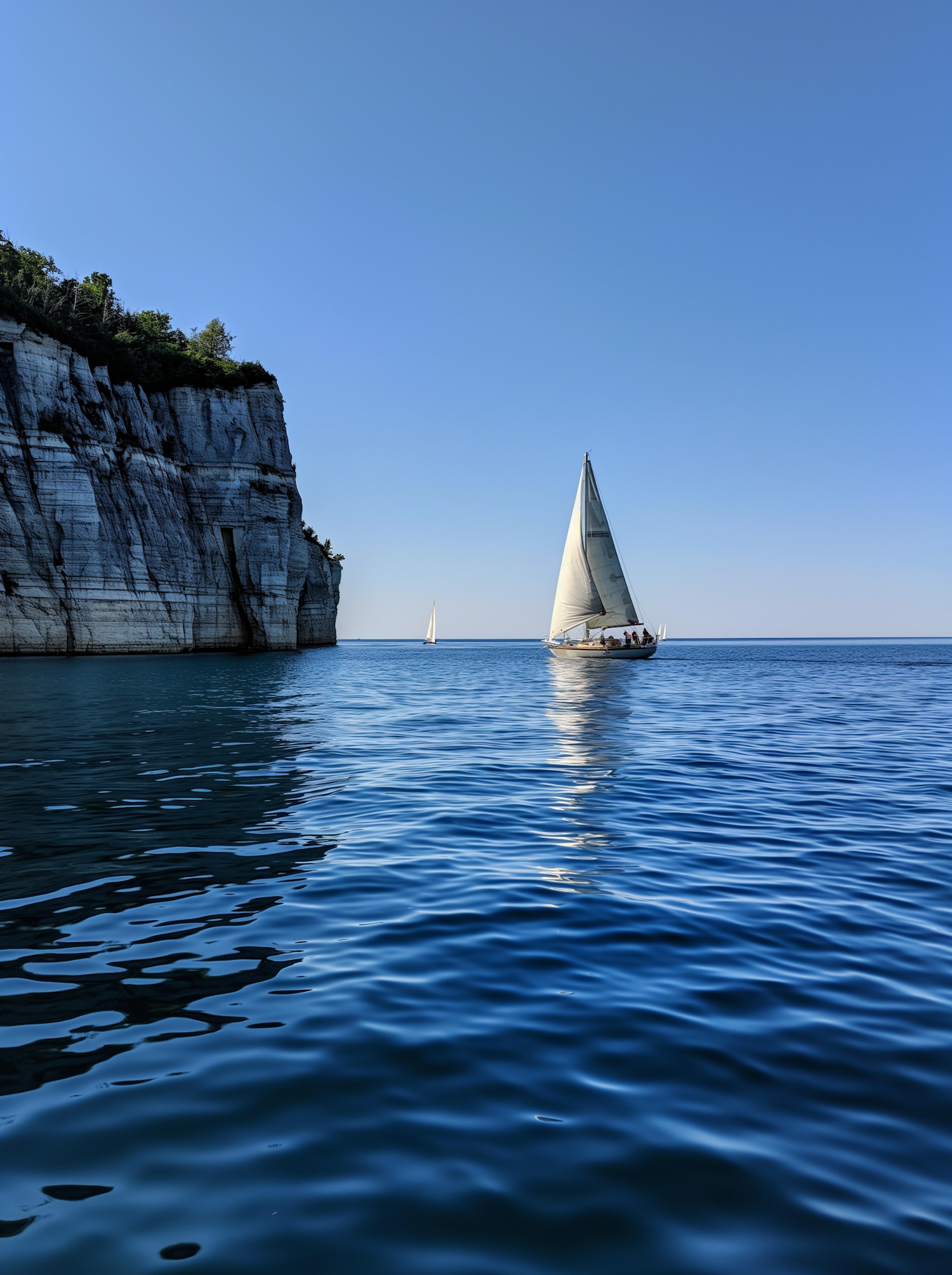 Sailboat gliding on calm blue waters near a towering cliff under a clear sky, capturing a serene and picturesque seascape.