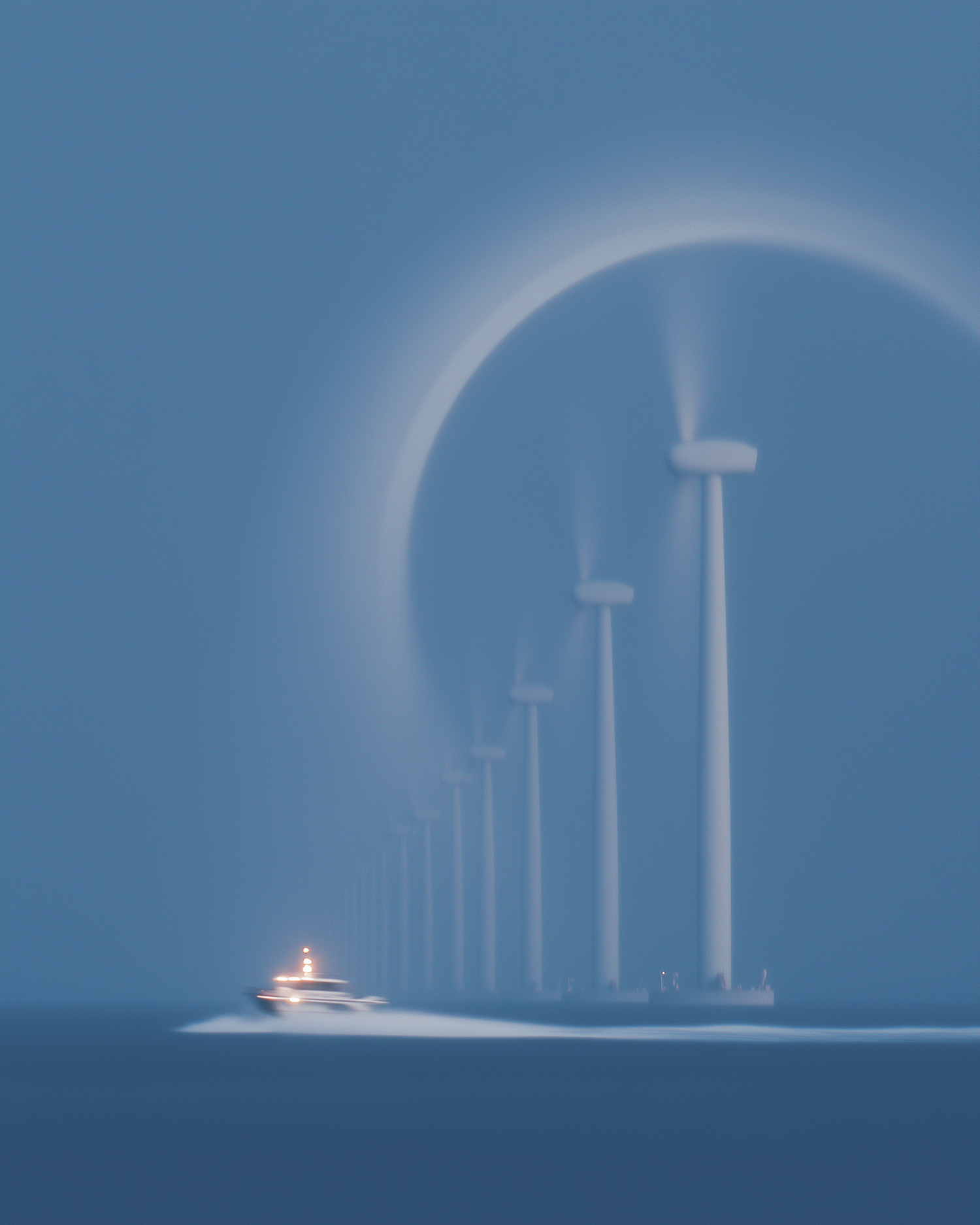 A boat glides past a row of wind turbines in a tranquil, blue-toned seascape, blending technology and nature in a serene setting.