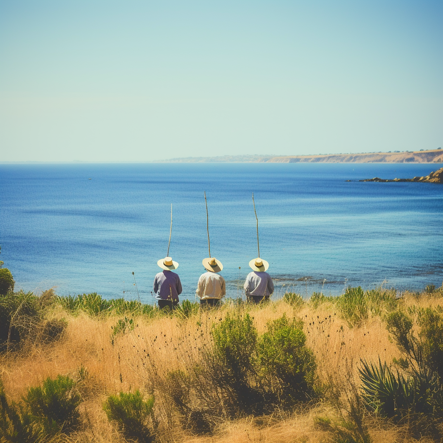 Three people fishing on a grassy hill overlooking a calm blue ocean under a clear sky, surrounded by golden grass and green shrubs.