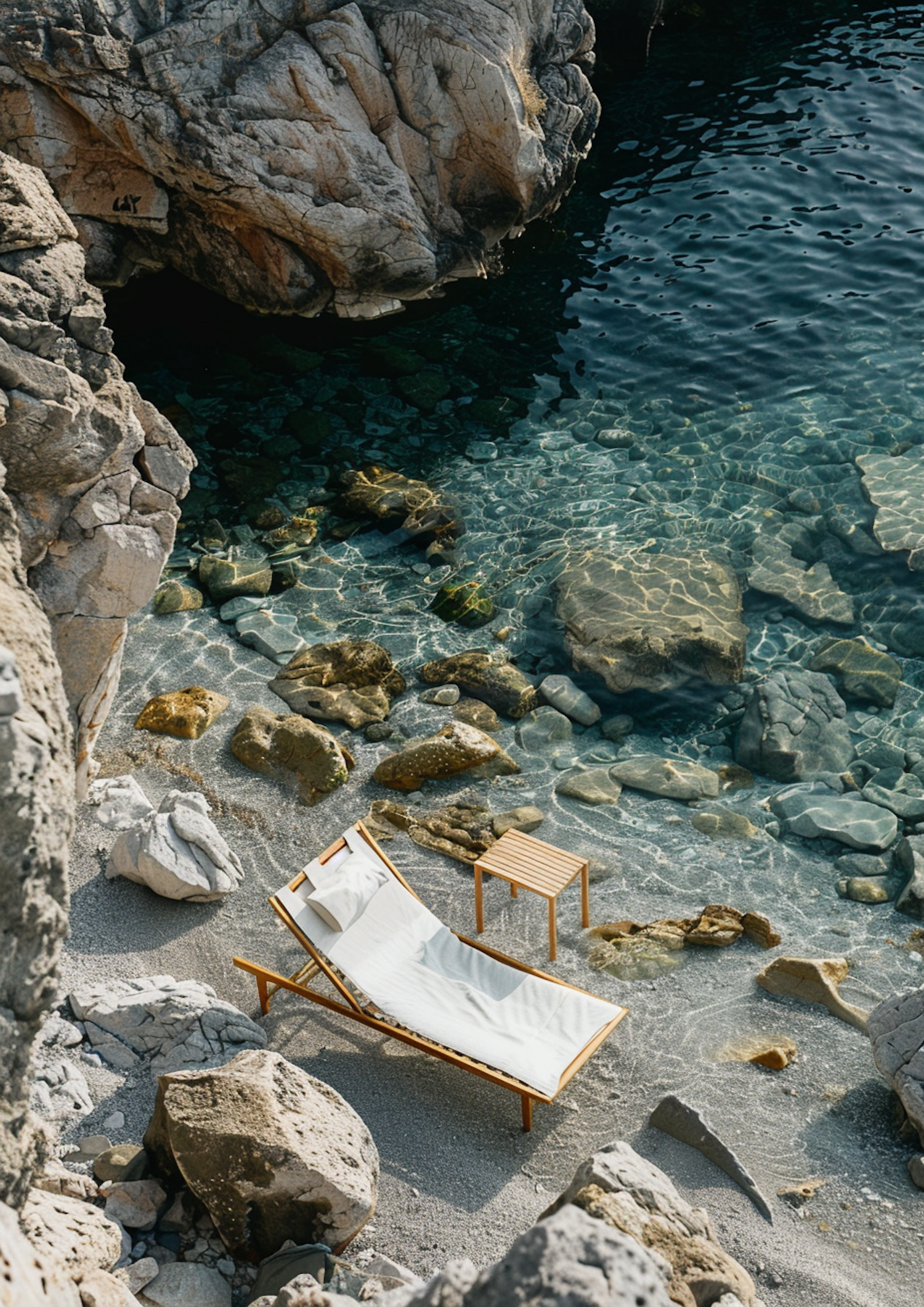 Tranquil rocky beach with a wooden lounge chair by clear turquoise waters, perfect for relaxation and enjoying nature's beauty.