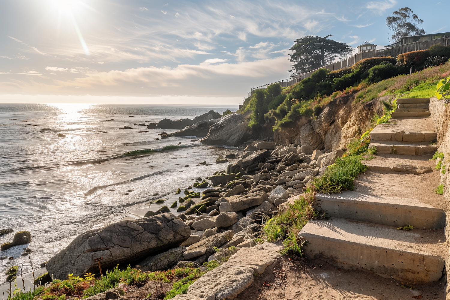 Scenic coastal view with rocky shoreline, sunlit ocean, and stone steps leading to the beach, surrounded by lush greenery.