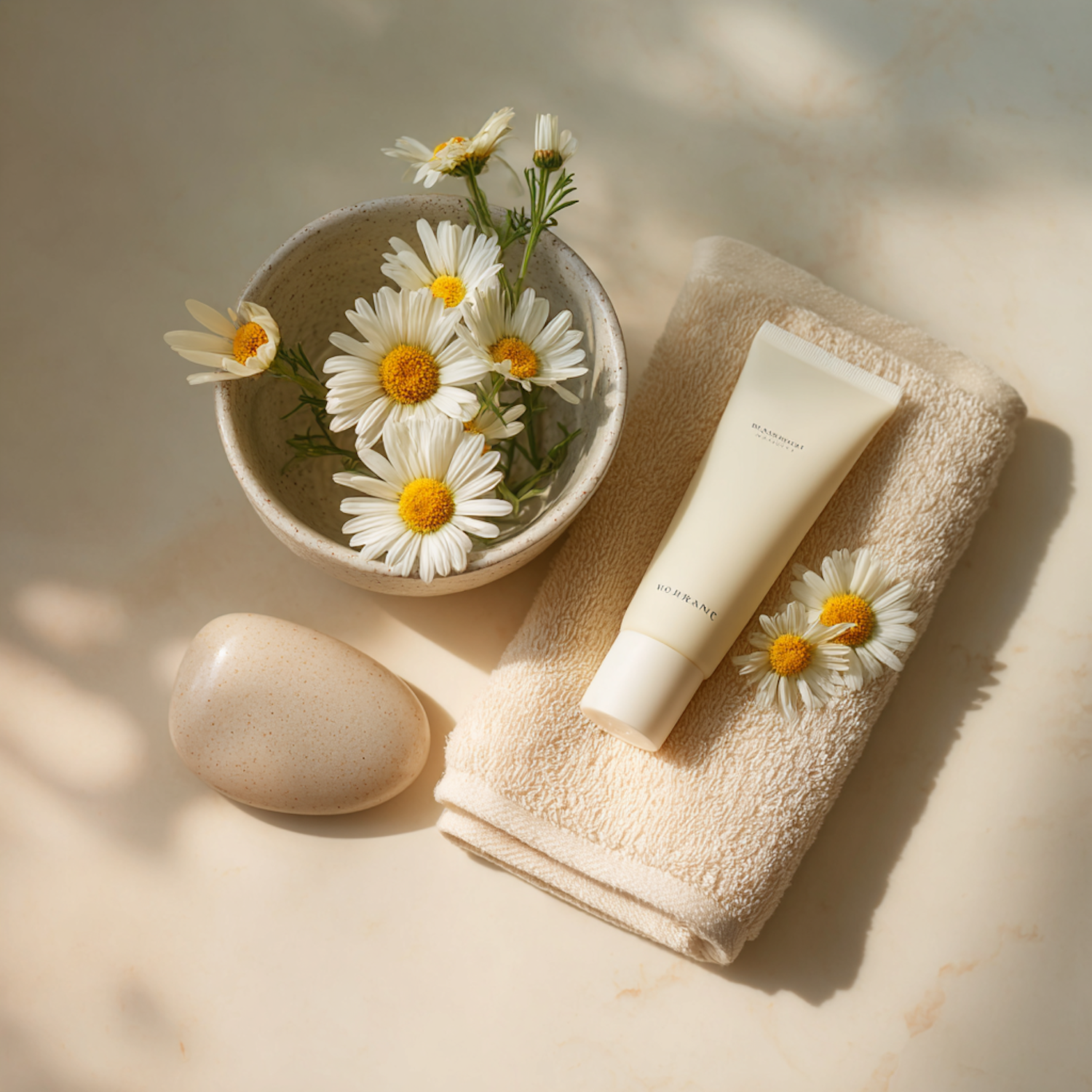 A calming arrangement of daisies, a towel, a cream tube, and a stone on a beige surface, perfect for a spa or self-care theme.