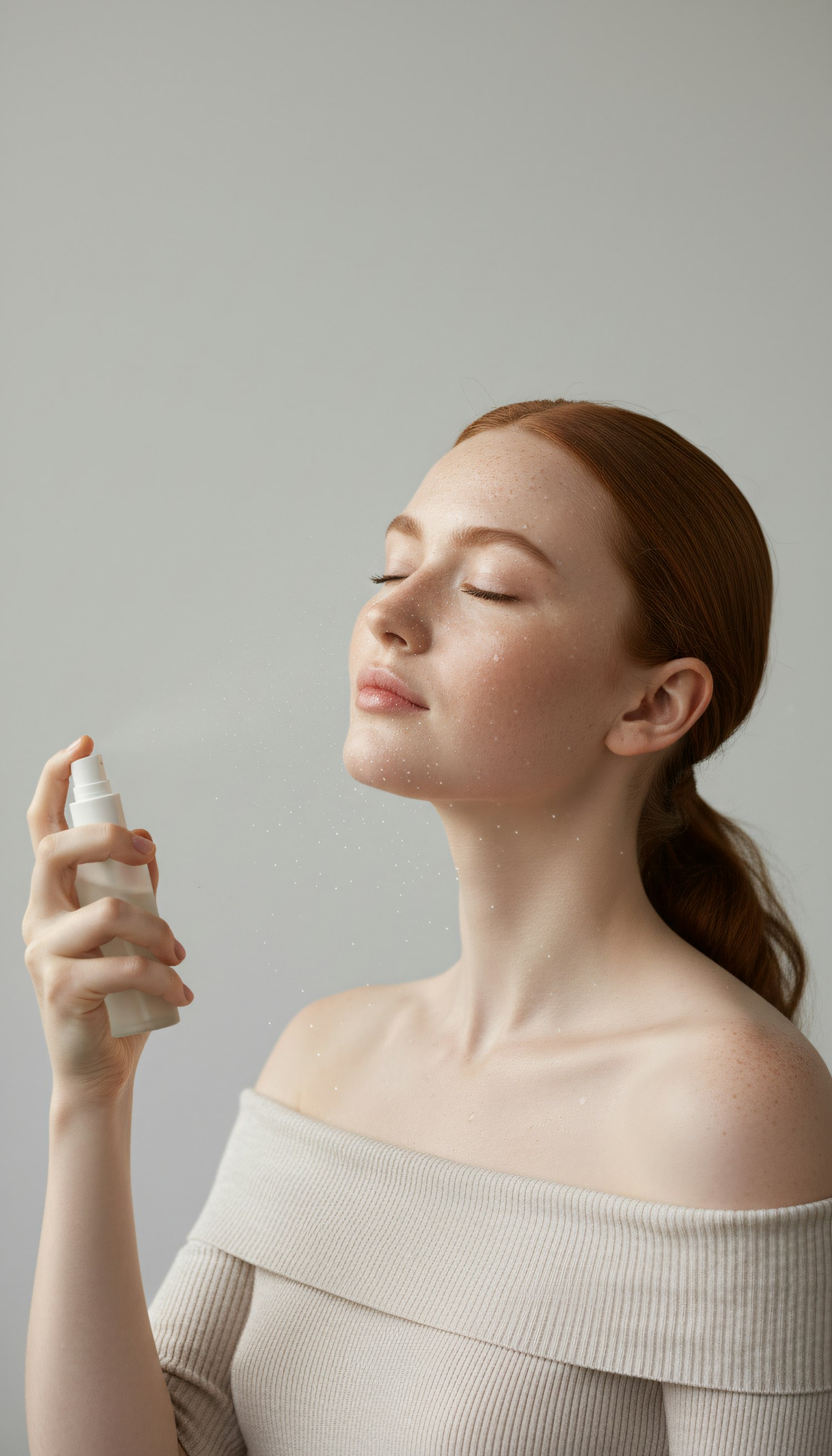 A serene moment of a woman spraying facial mist, showcasing self-care and relaxation with a neutral background and soft lighting.