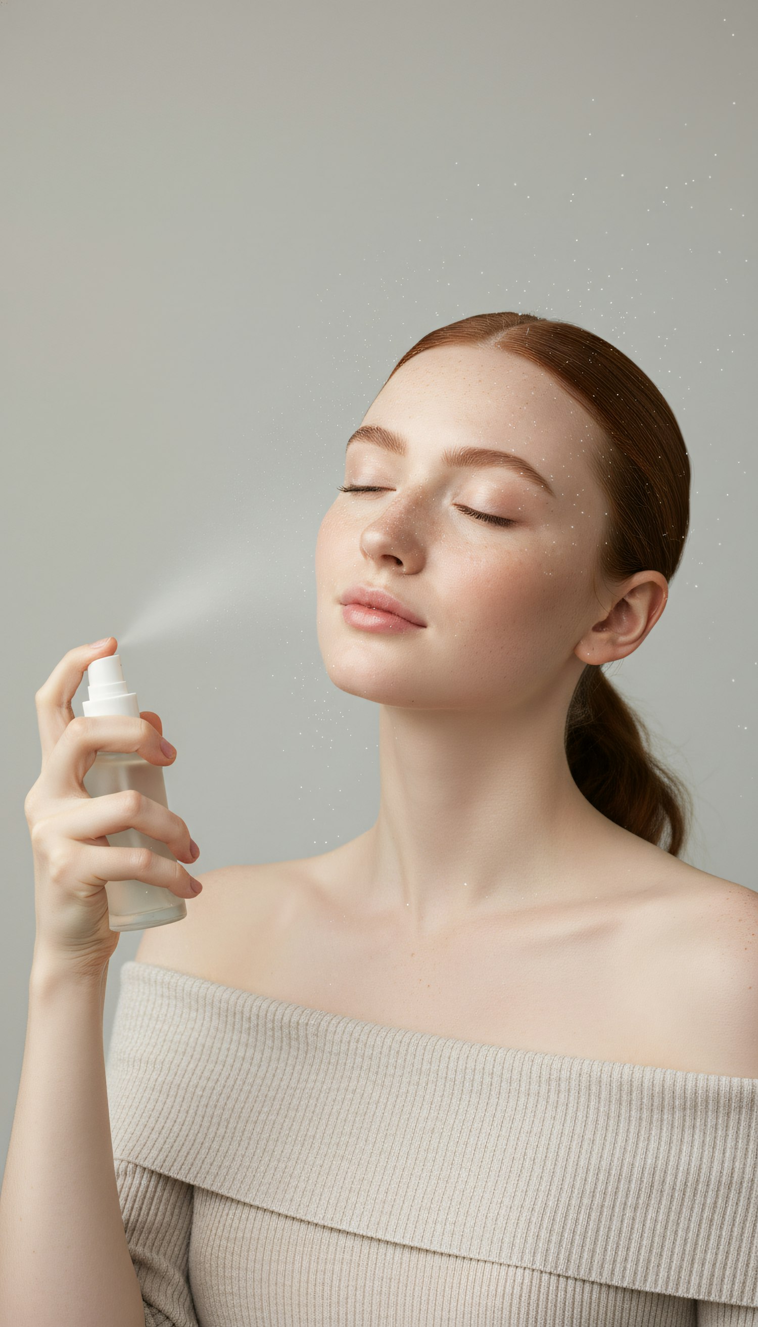 A serene moment of a woman spraying facial mist, showcasing skincare and self-care in a minimalist setting.